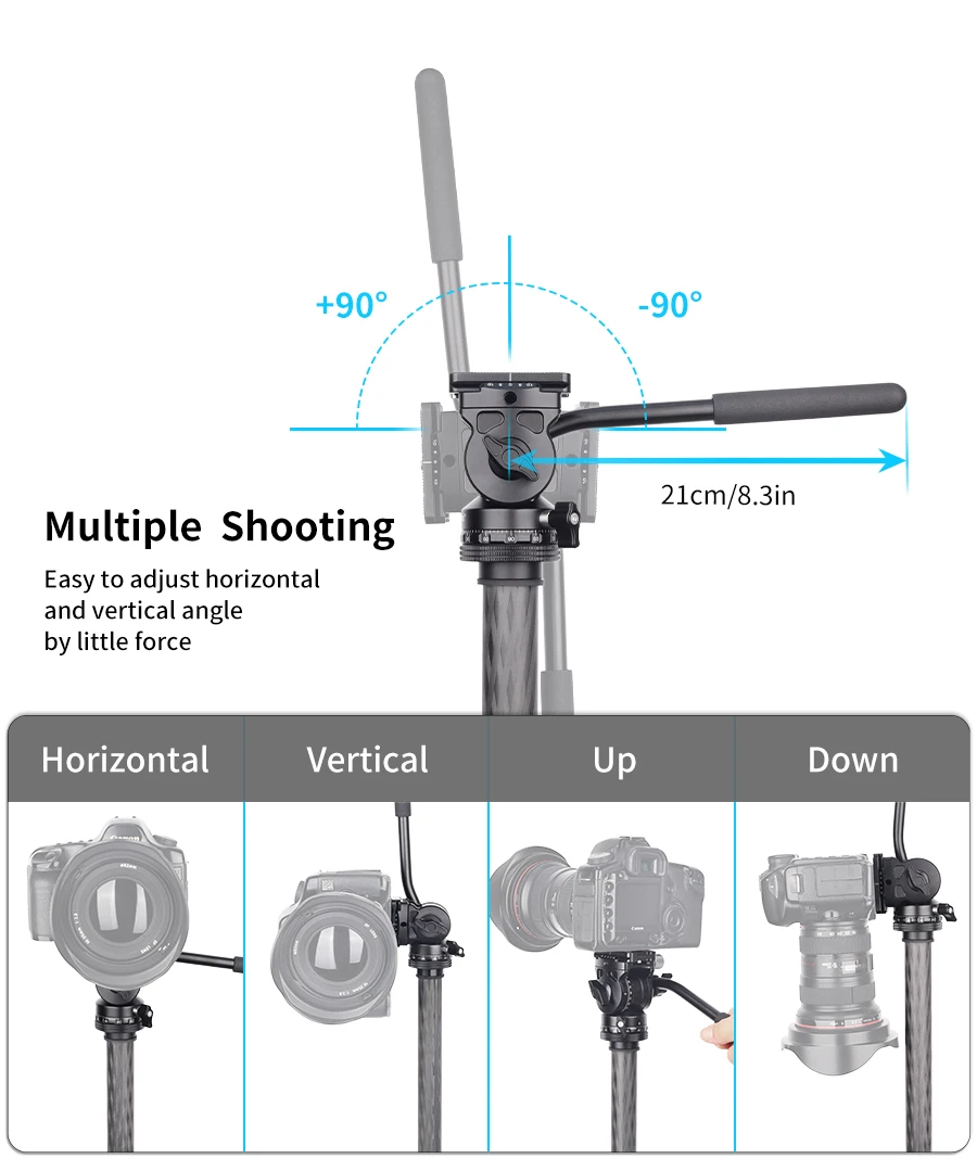 360Rotation & Multi-Angle TiltingThe fluid head provides panoramic smooth movements and well-damped, easy to control. With the main tilt knob, pan locking lever and sponge handle, you can easily rotate the head 360 or tilt it from -90 to 90, achieve multi-angle shooting and smooth footage.