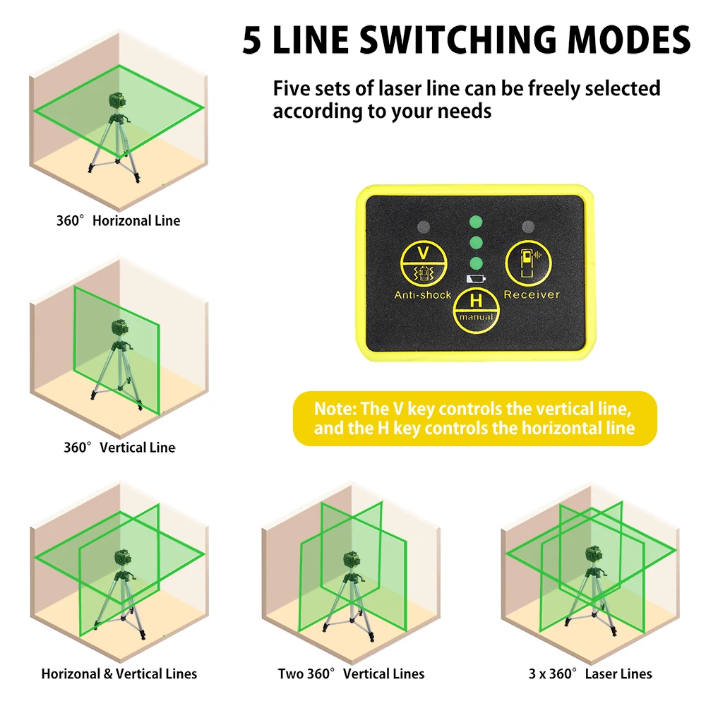 On state, press and hold the "Anti-shake" button for about 3 seconds, when the indicator light stops flashing, it will enter the anti-shock mode. In this mode, the laser line will be automatically turned off due to vibration, tilt or displacement, which for improving the error caused by vibration or wind during construction. This mode can be turned off by turning off the power or long pressing the "Anti-shake" button.