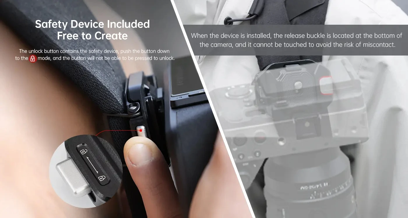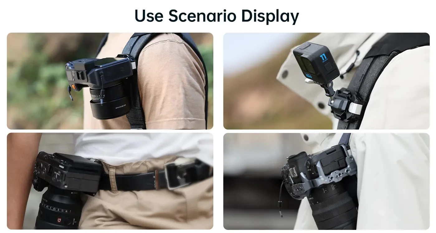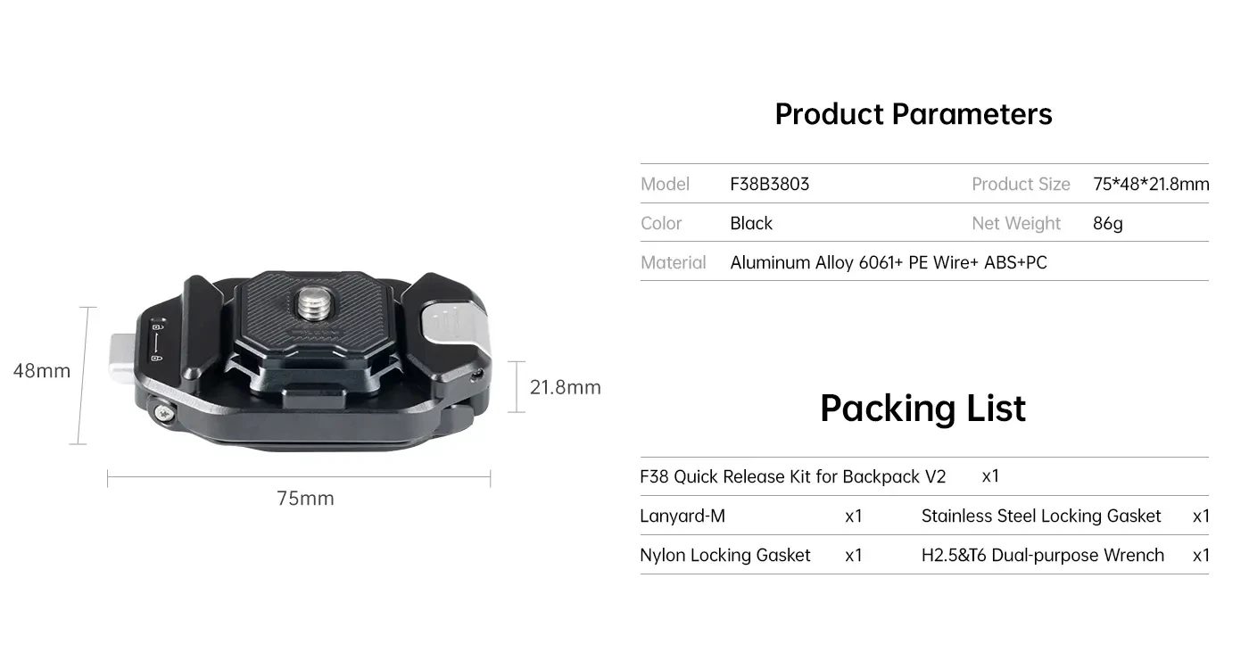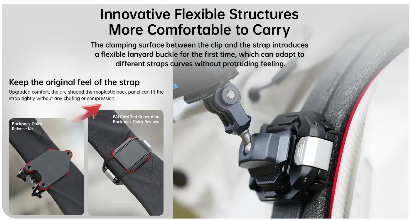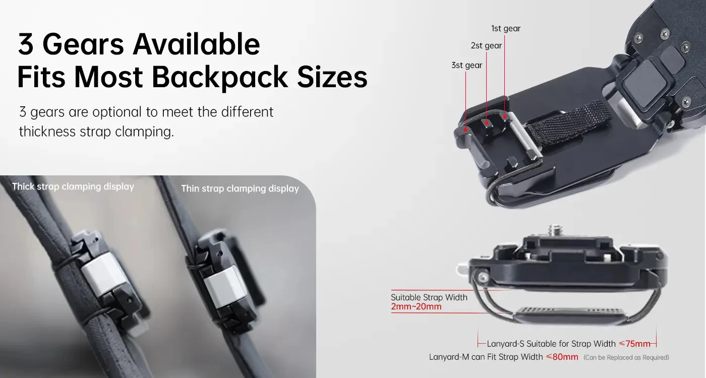 T-shaped Buckle Fixing Structure Smoother Installation. There is no need for complex screw fixing, F38 Quick Release Kit for Backpack V2 adopts lanyard + T-shaped buckle fixing structure, one click and close, it can be clamped.