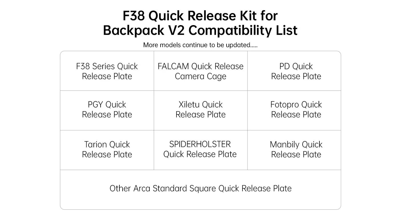 Compatibility: F38 Series QR Plate, FALCAM Camera Cage, PD QR Plate, PGY QR Plate, Fotopro QR Plate, Tarion QR Plate, Xiletu QR Plate, Tarion QR Plate, SPIDERHOLSTER QR Plate, Manbily QR Plate, and Other Arca Standard Square Quick Release Plate.