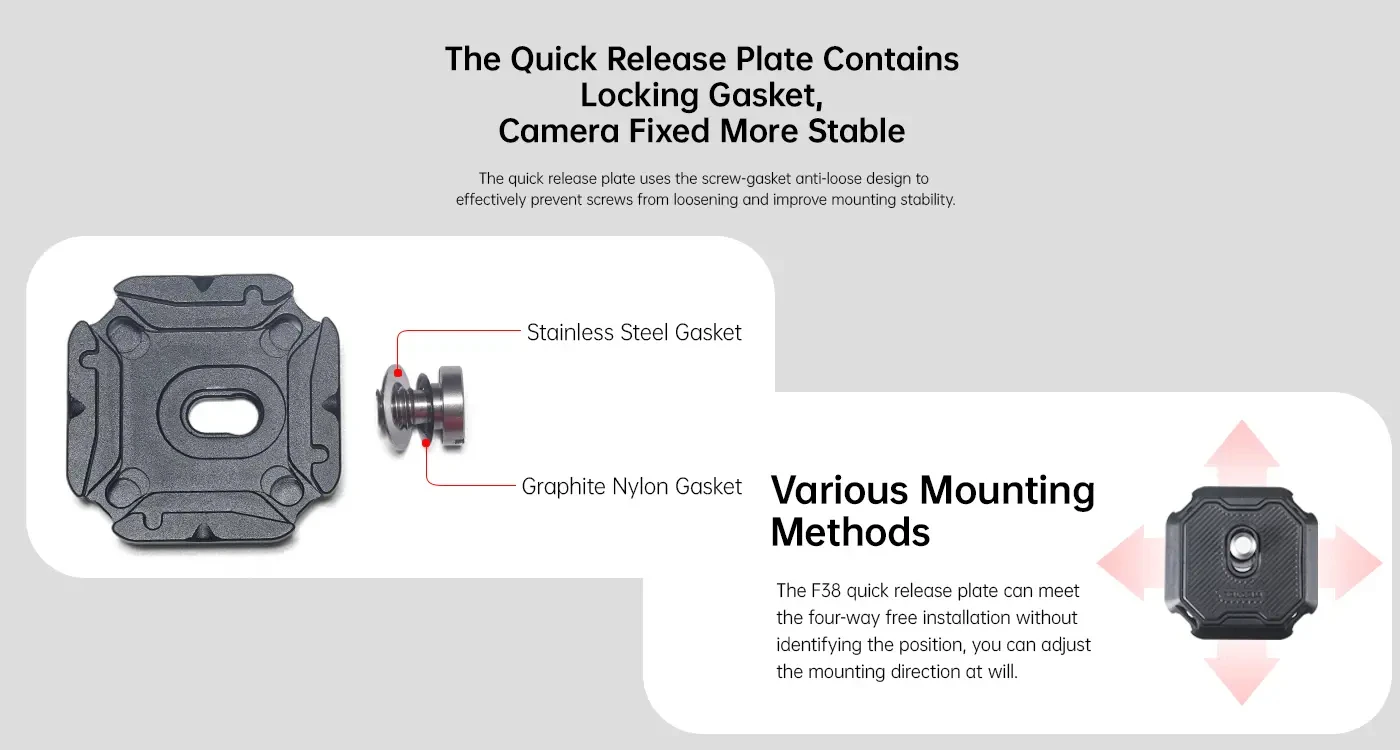 The Quick Release Plate Contains Locking Gasket, Camera is Fixed More Stable. The quick release plates fit seamlessly, maintaining excellent stability even in running, hiking, off-roading, and other strenuous activities.
