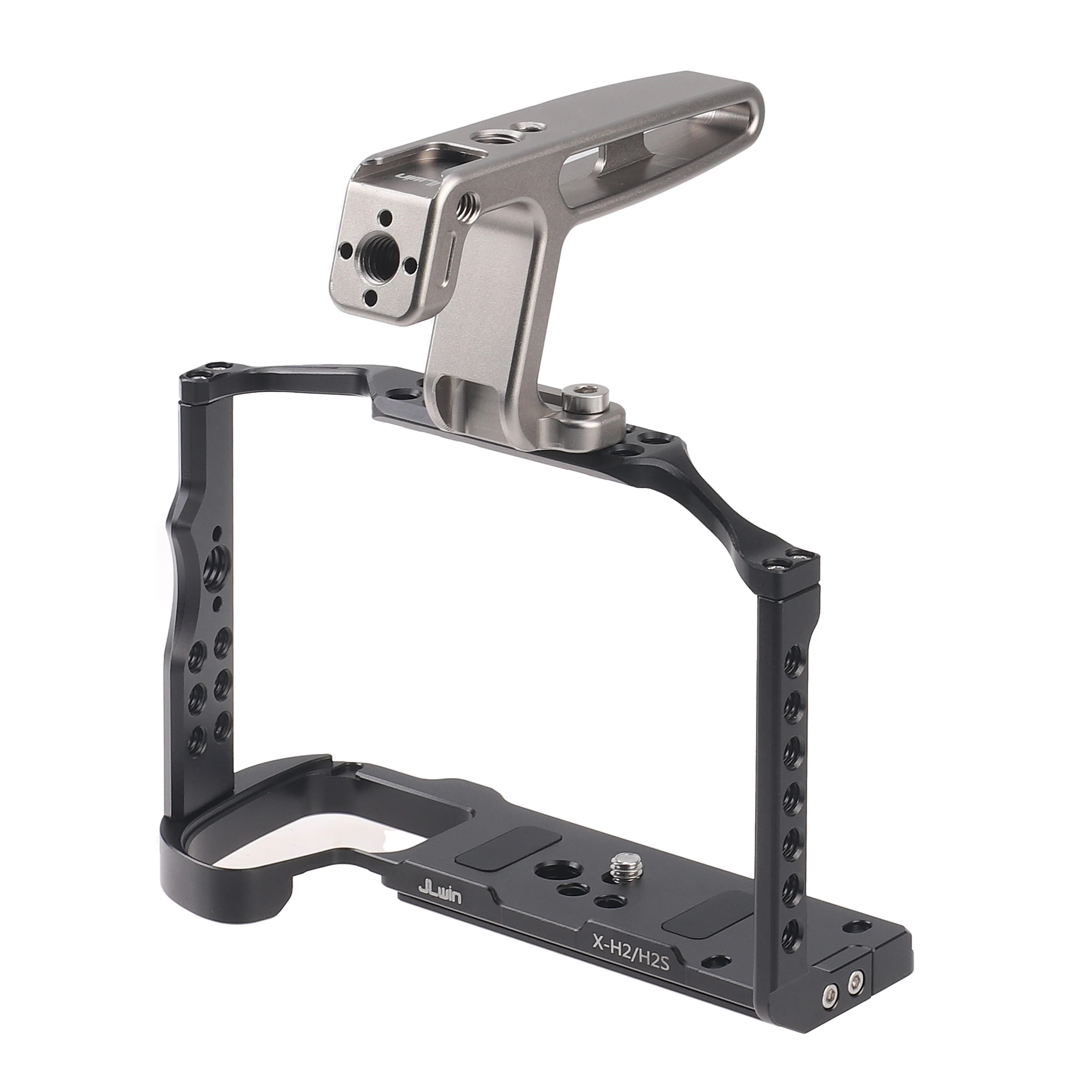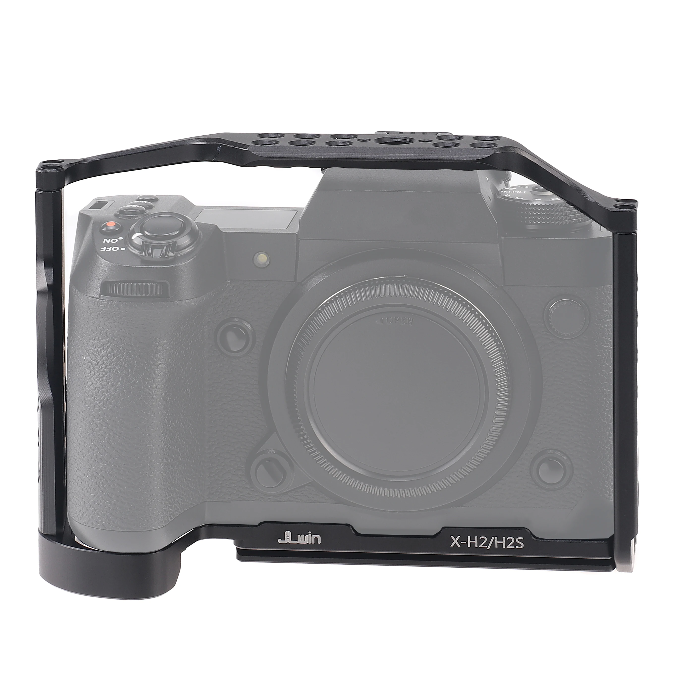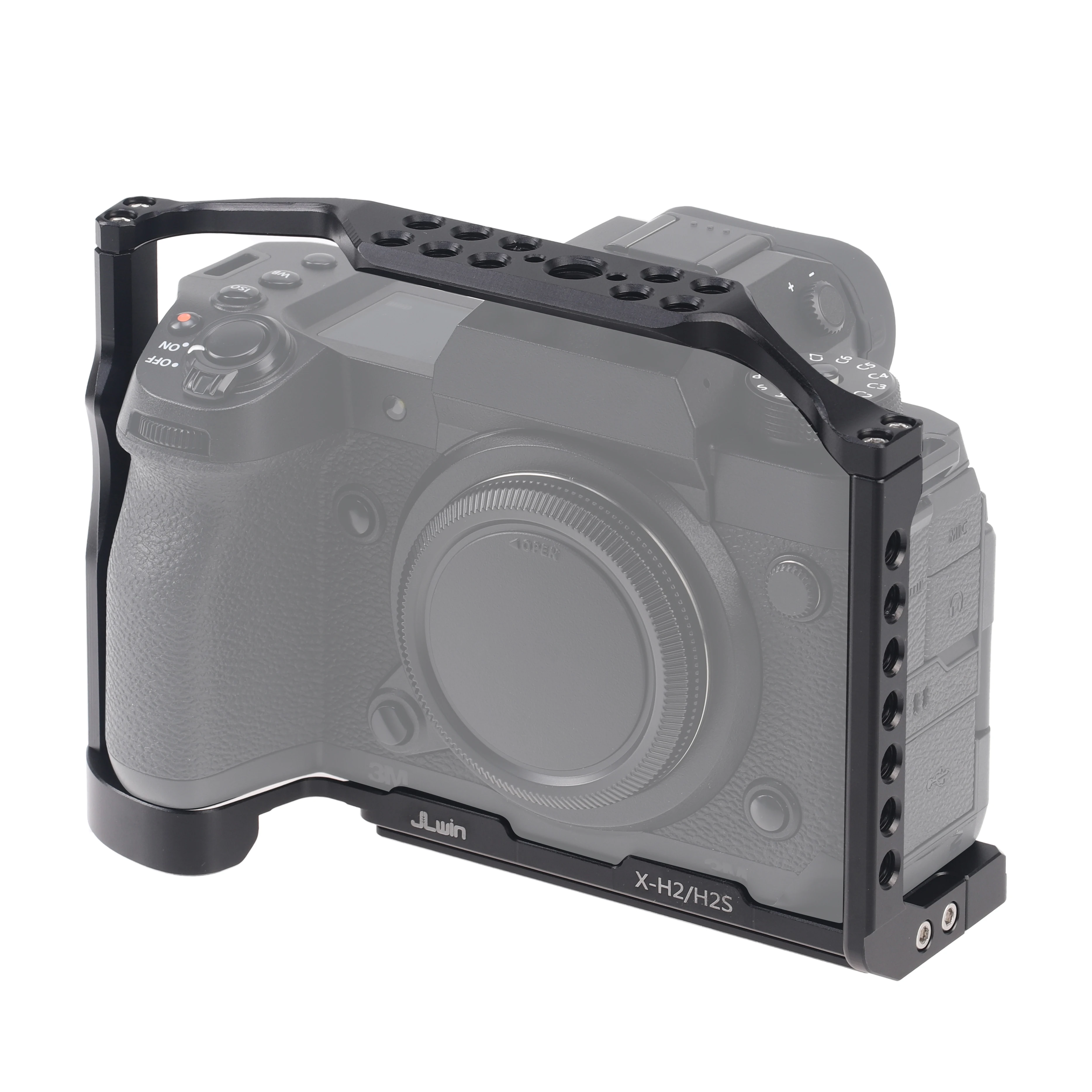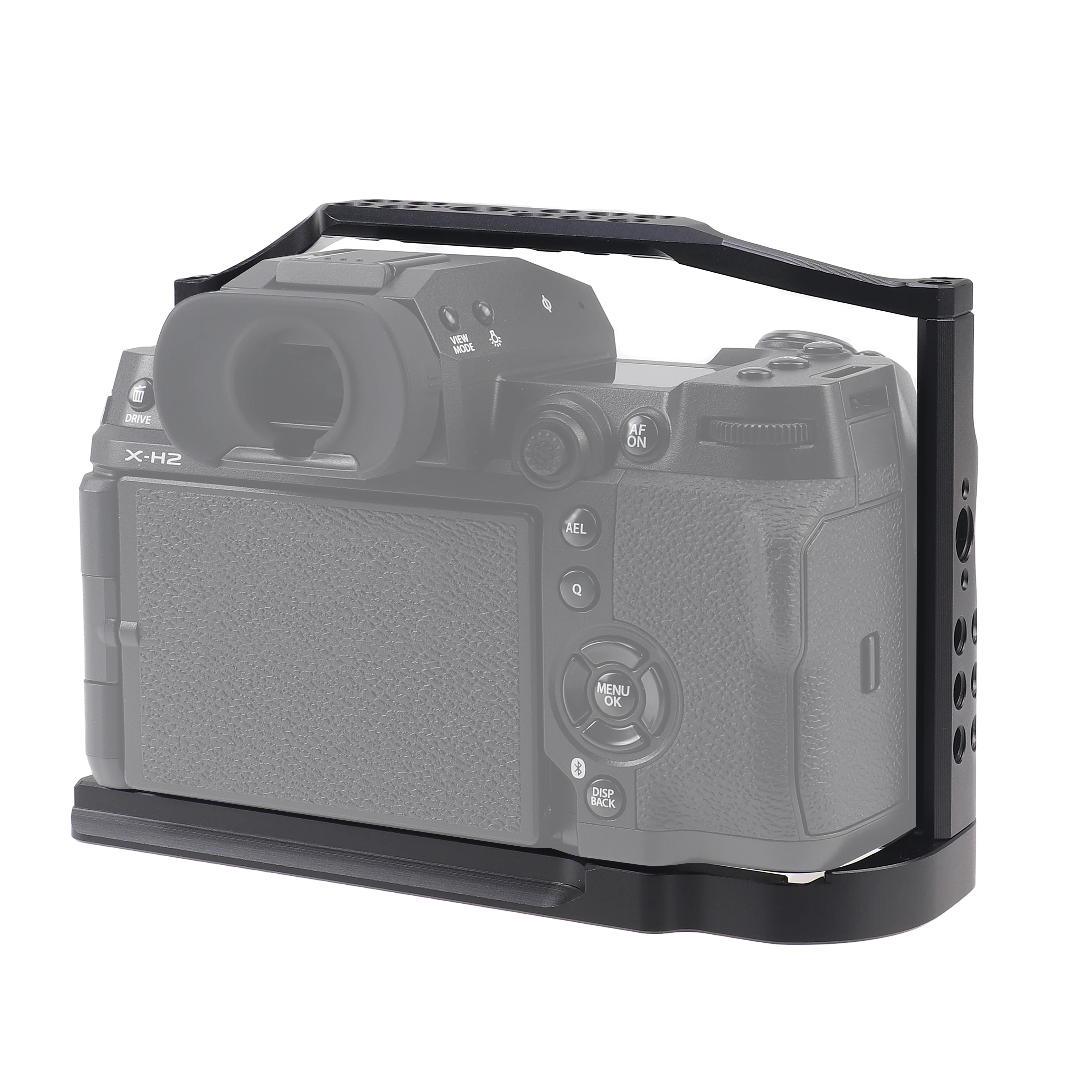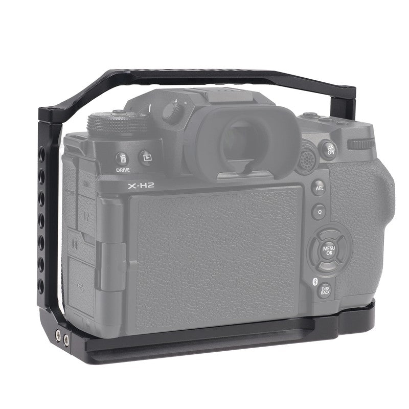 Aluminum Camera Cage is specifically designed for Fuji X-H2/X-H2S Camera. It is a full cage which is lightweight and perfectly form-fitting the camera. It is equipped with multiple 1/4" -20 and 3/8" -16 threaded holes, ARRl locating hole and cold shoe for accessories mounting.