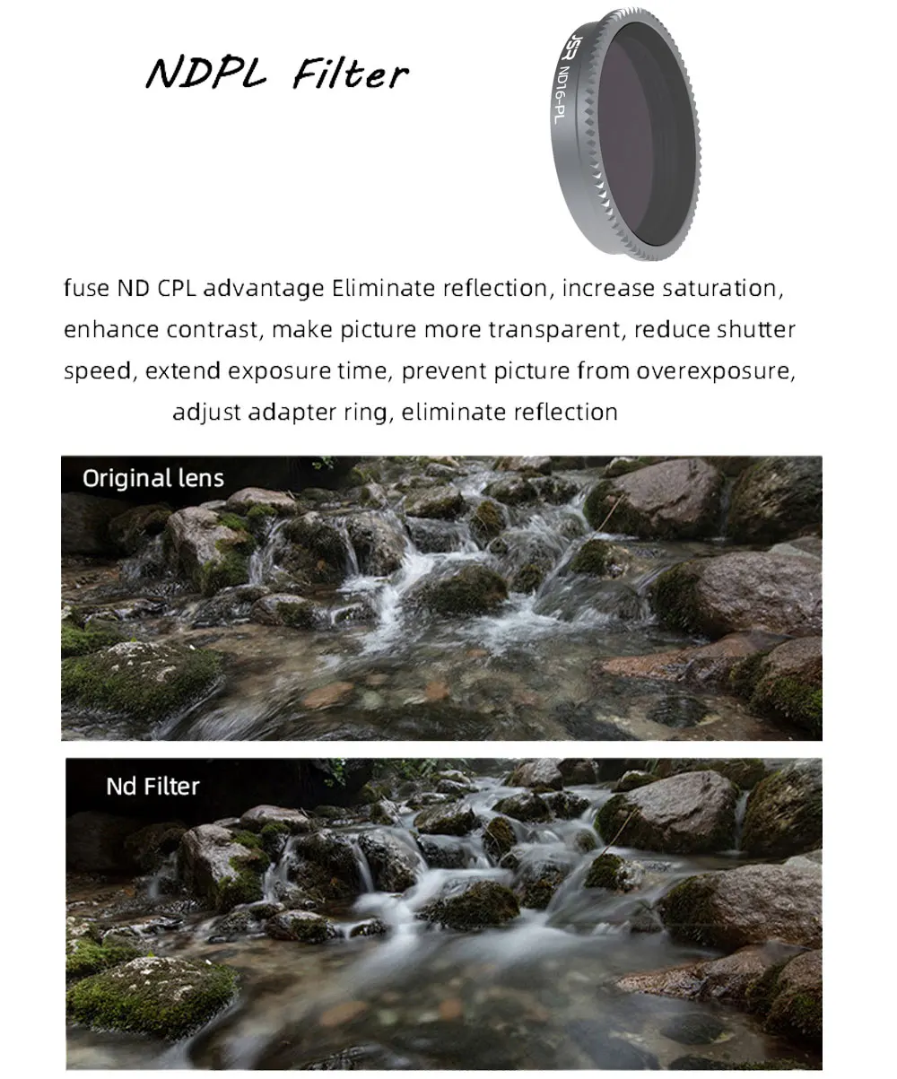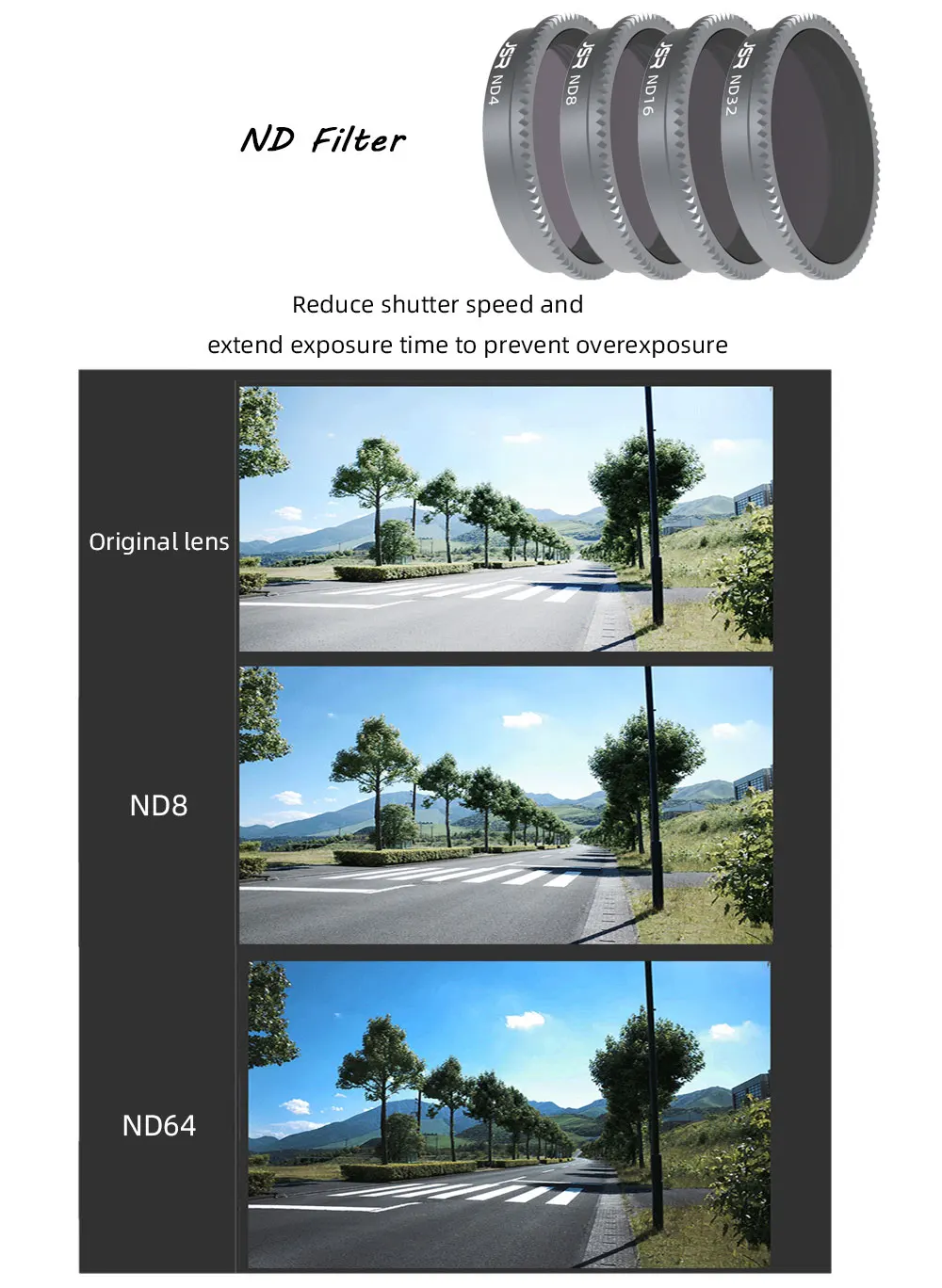 - You can get more freedom to control the aperture and shutter, bring more creative space for exposure methods, and effectively prevent overexposure. The number behind ND represents the ability of the ND lens to block light
