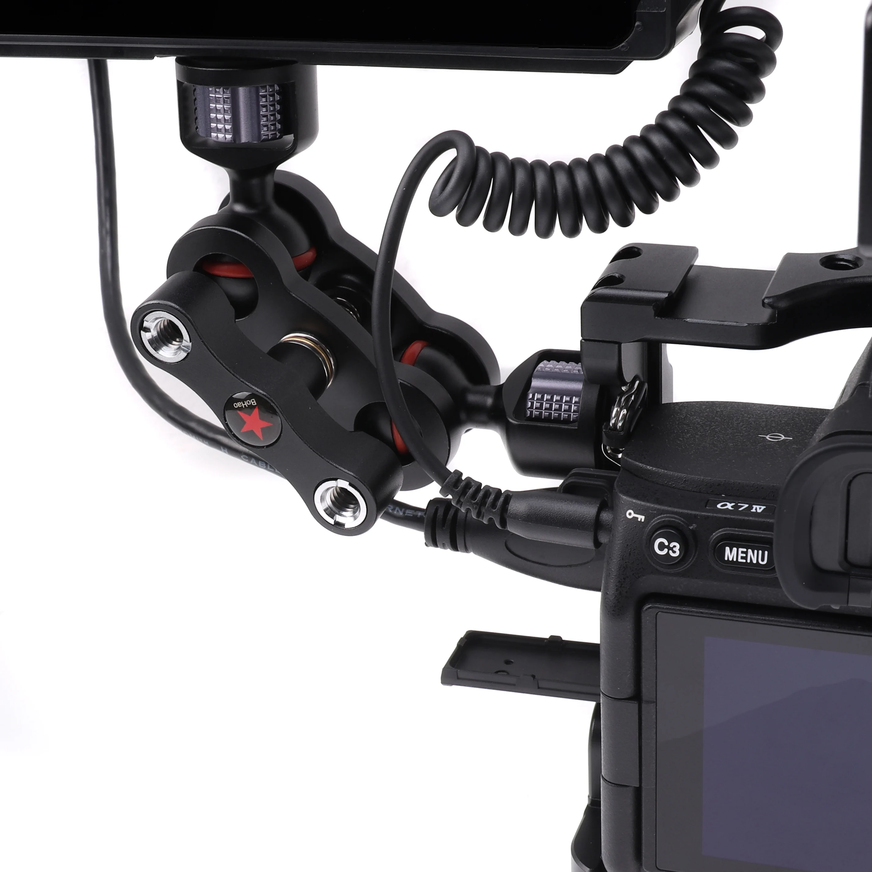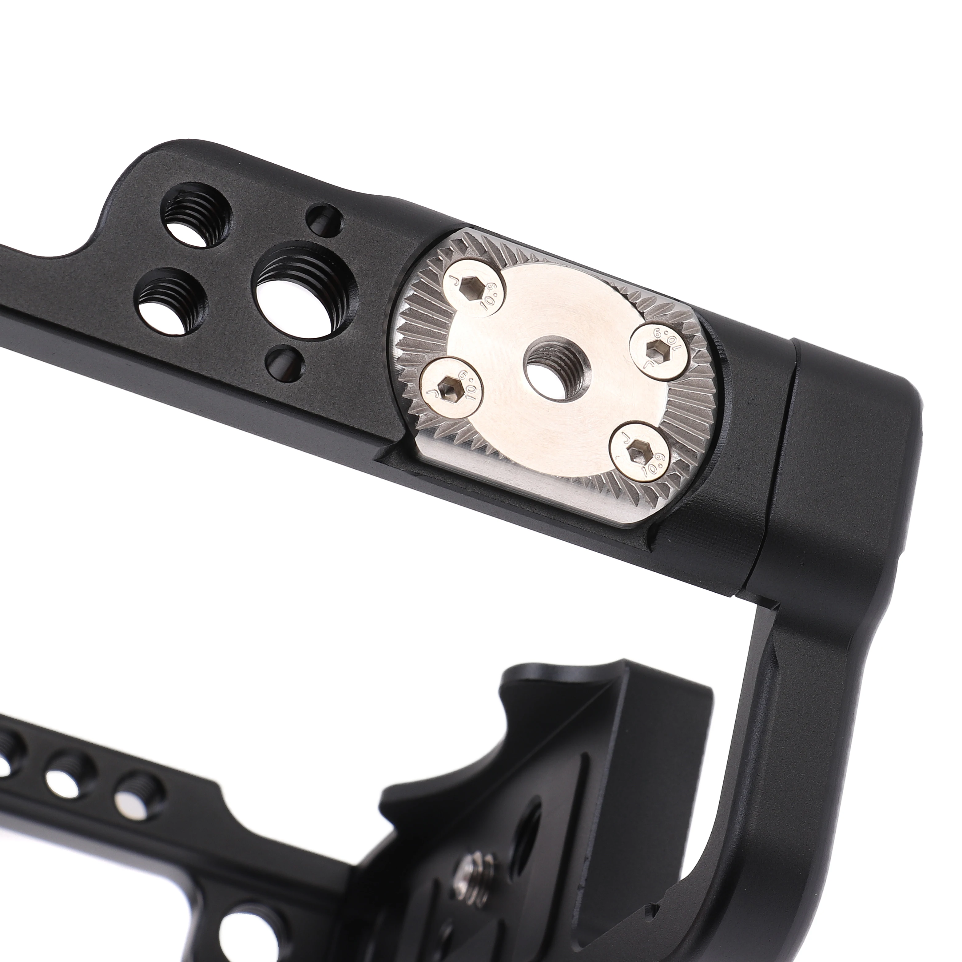 Lightweight cavity design, a large number of 1/4" -20 & 3/8" -16 threaded holes, ARRl 3/8" threaded hole and a bulit-in cold shoe mount on the top for microphone, LED lights or the monitor bracket mounting. Nato rail on the left side allows to quick release accessory with nato clamp.