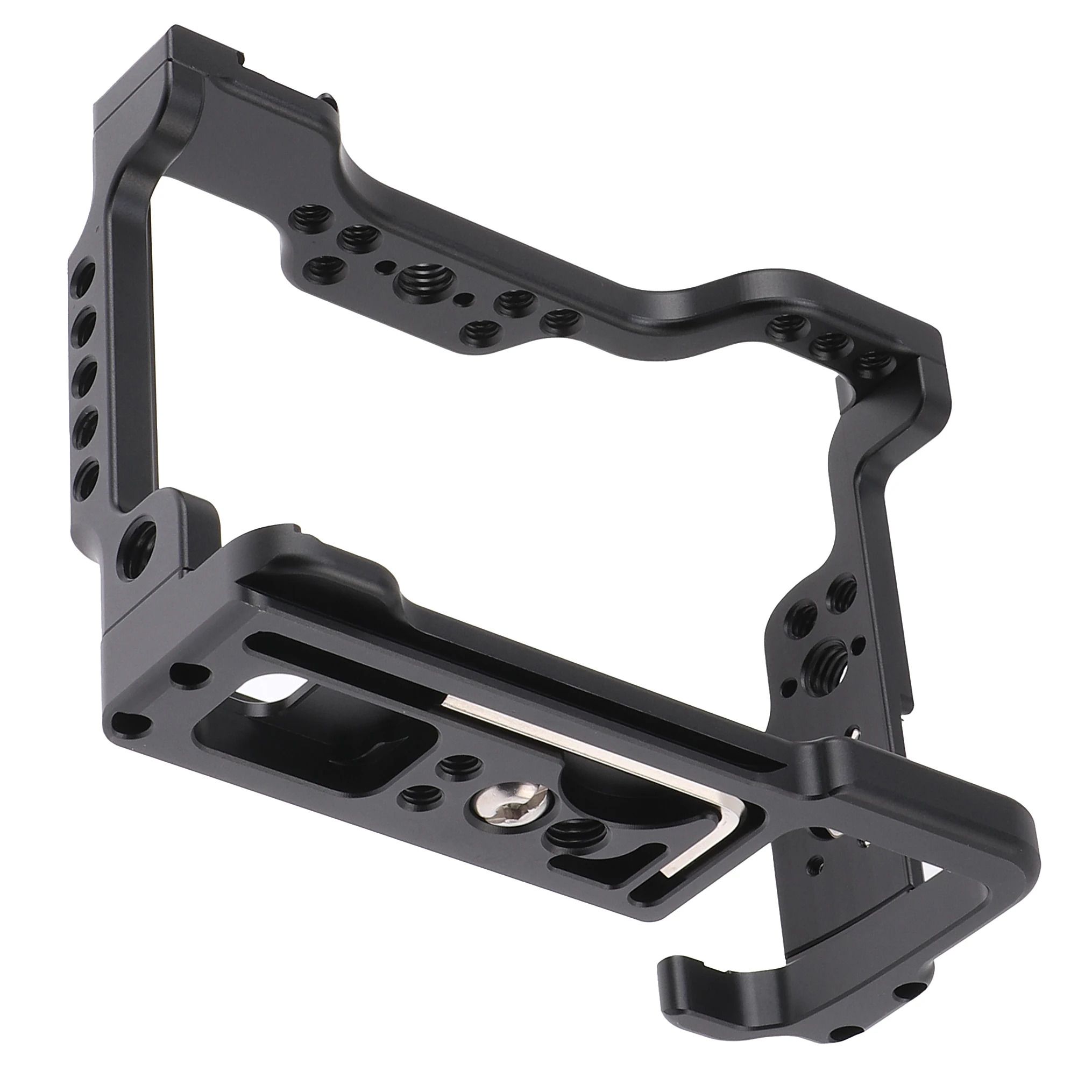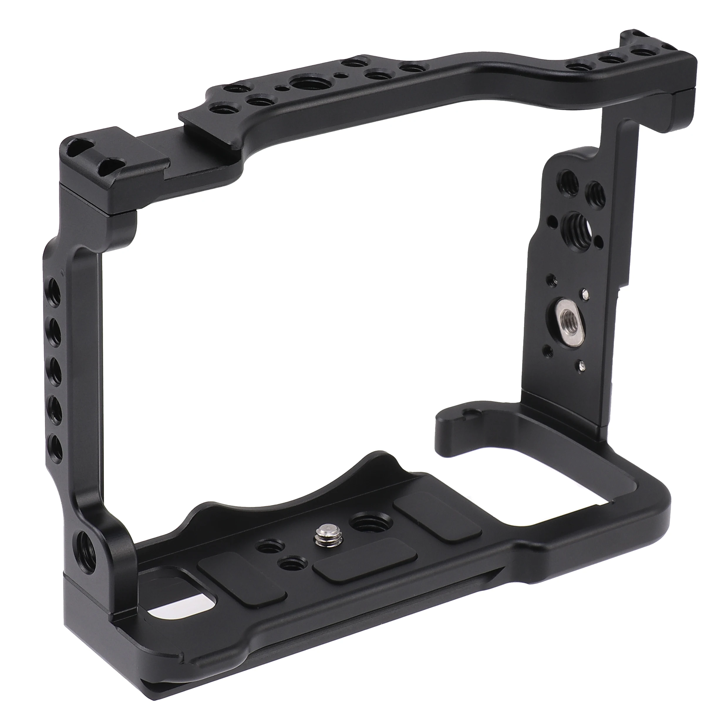The bottom of the cage has anti-slip pads and anti-deflection design to protect the camera from scratching and movement. It also built in 1/4" -20 screw holes on the bottom to attach the camera to tripod.