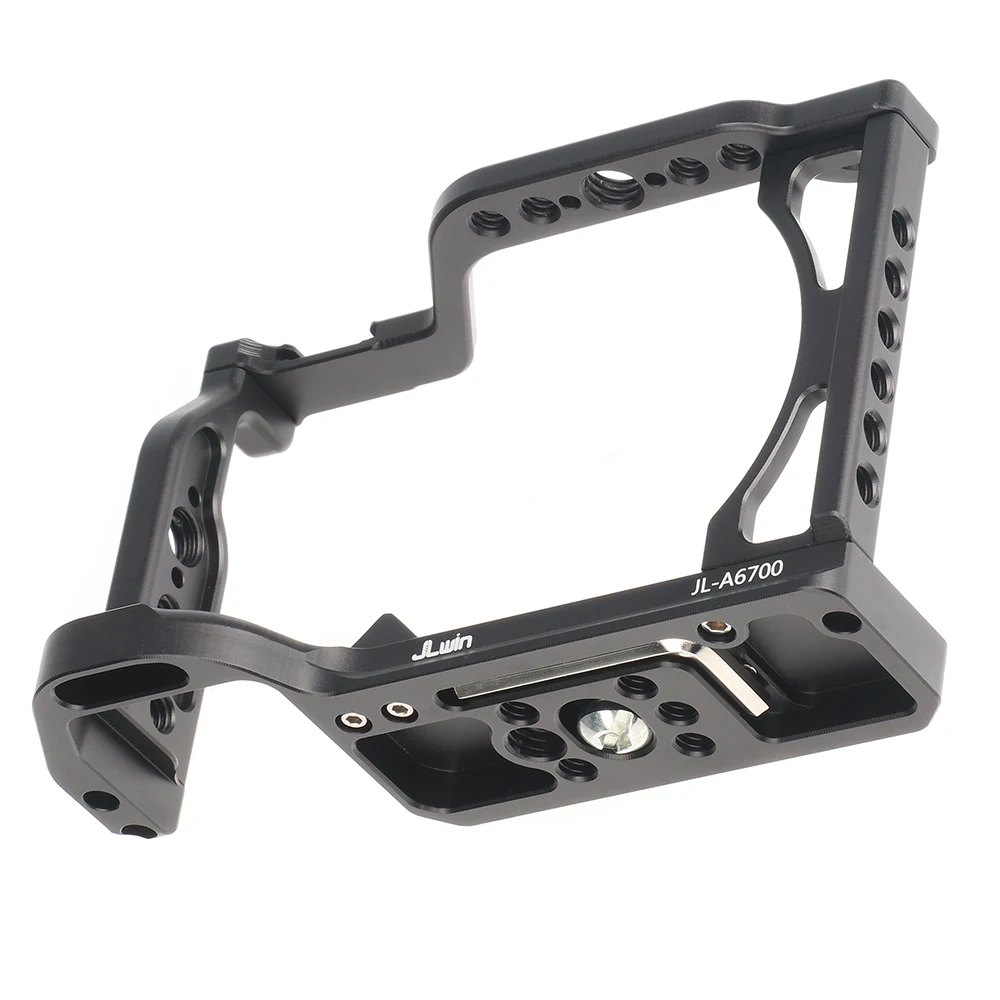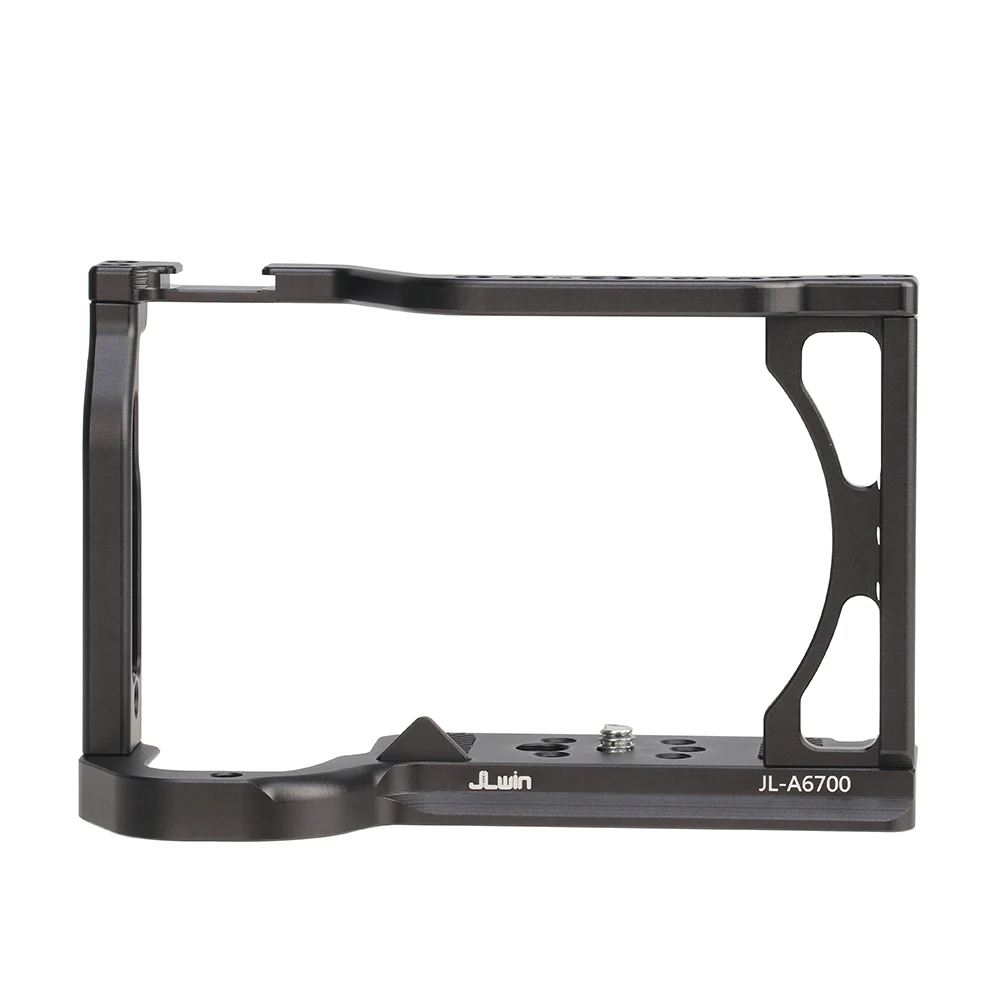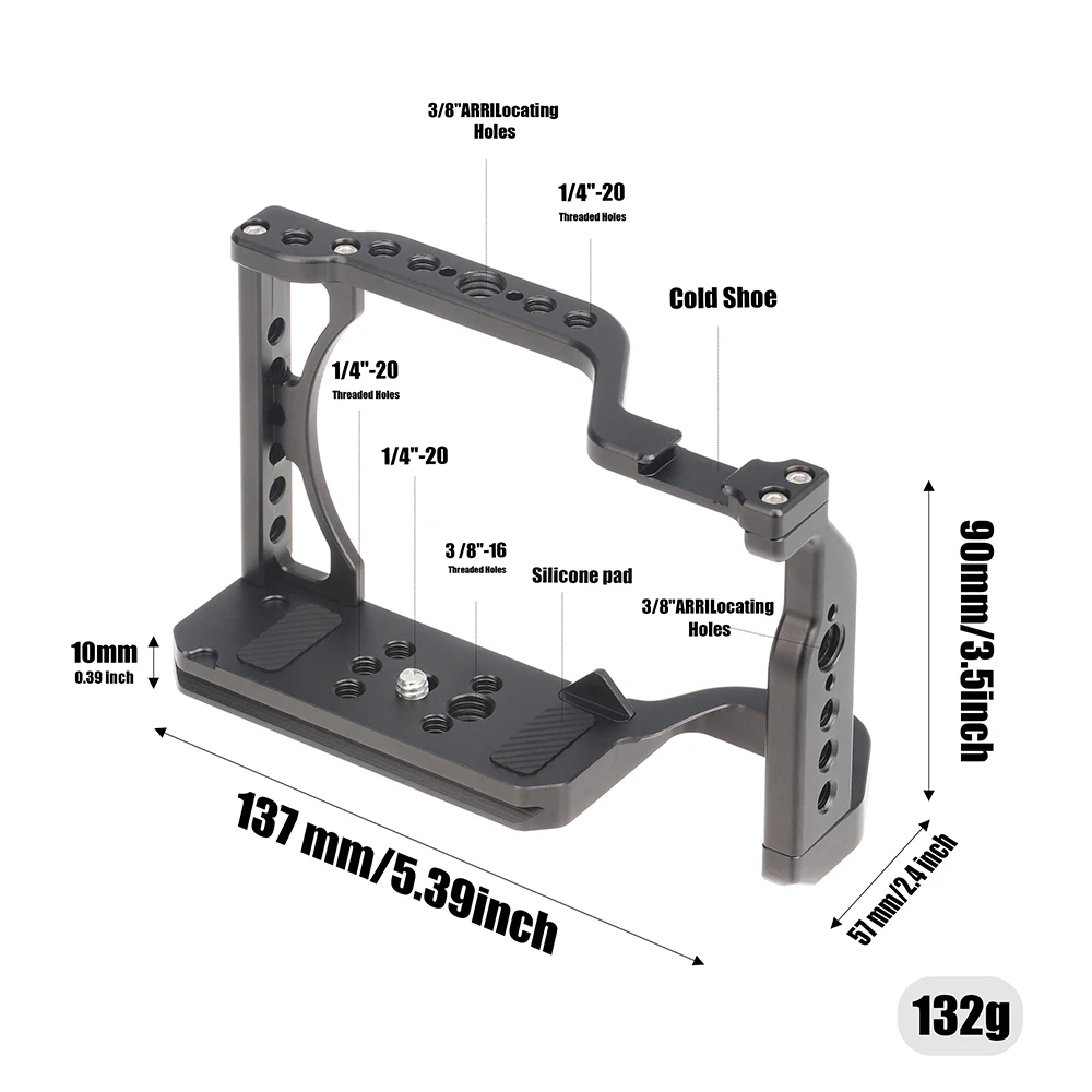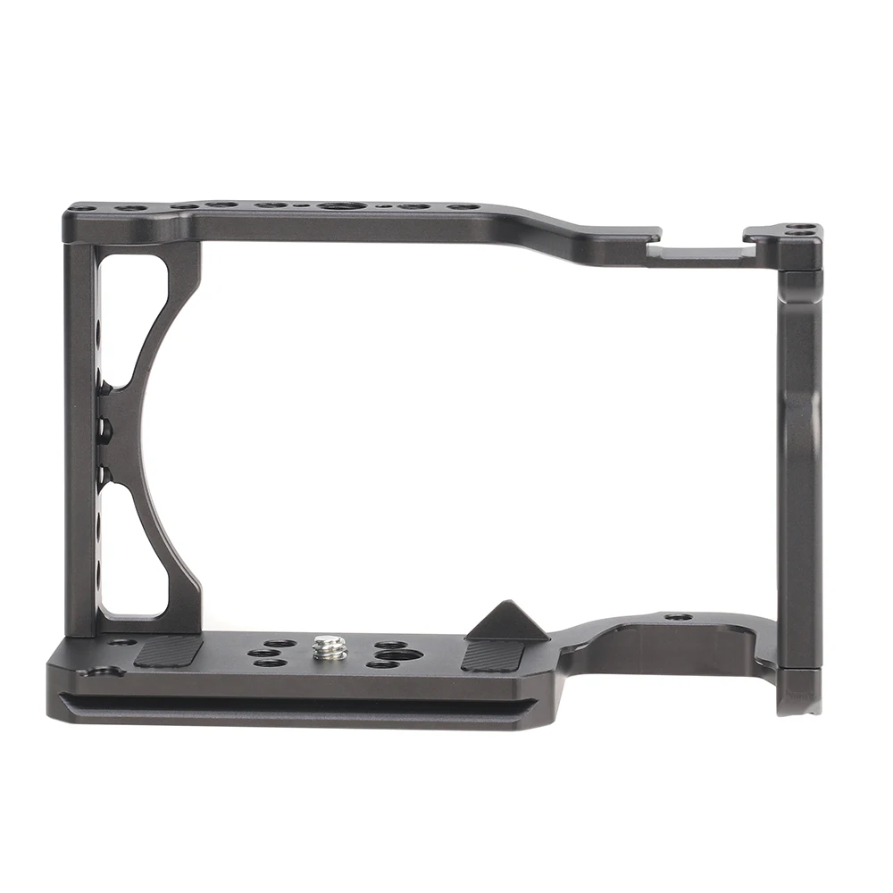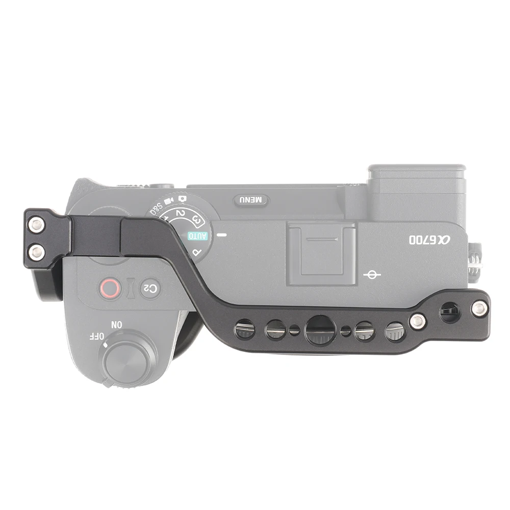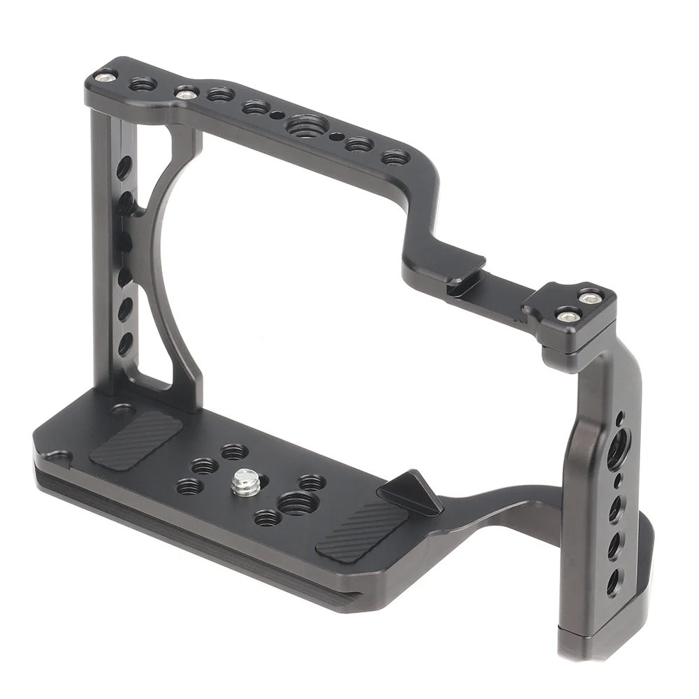 Aluminum Camera Cage is specifically designed for Sony A6700 Camera. It is a full cage which is lightweight and perfectly form-fitting the camera. It is equipped with multiple 1/4" -20 and 3/8" -16 threaded holes, ARRl locating hole and cold shoe for accessories mounting.