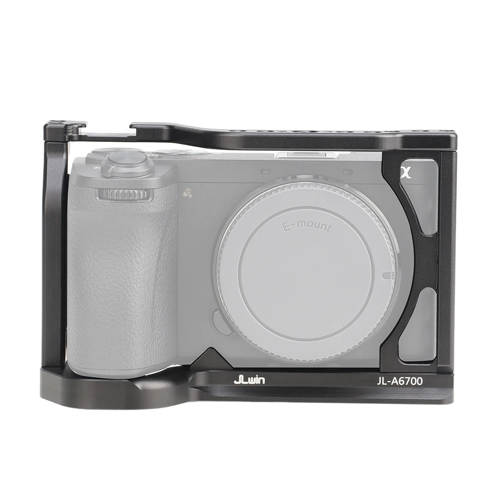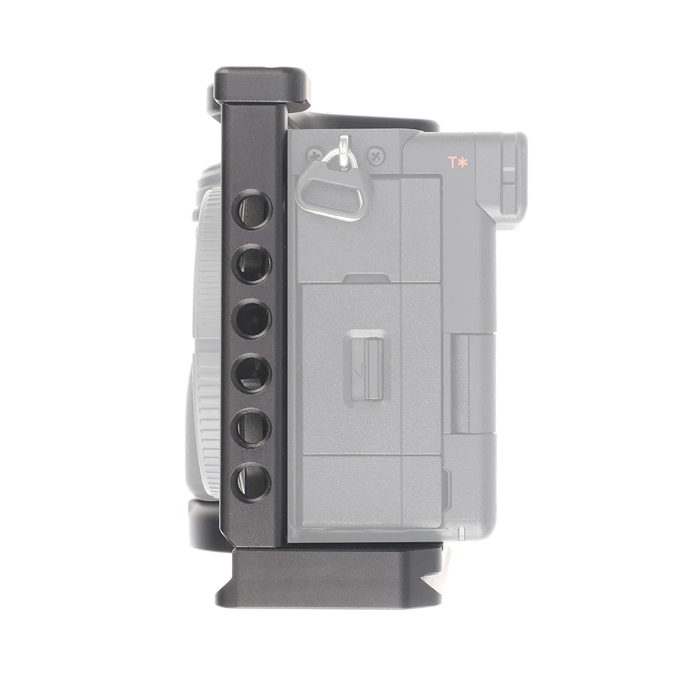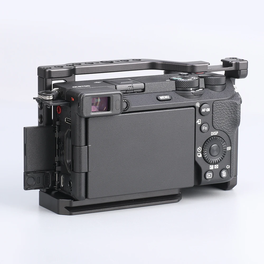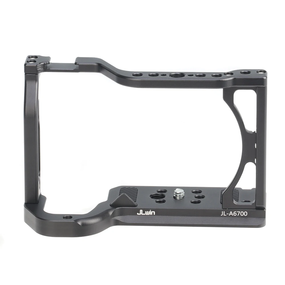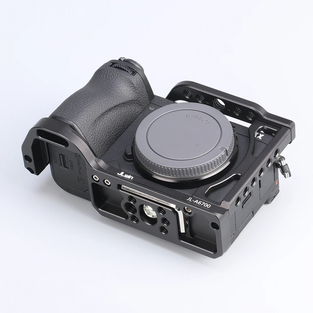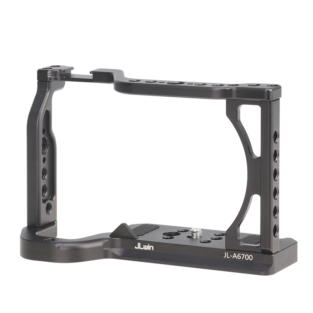 Aluminum Camera Cage is specifically designed for Sony A6700 Camera. It is a full cage which is lightweight and perfectly form-fitting the camera. It is equipped with multiple 1/4" -20 and 3/8" -16 threaded holes, ARRl locating hole and cold shoe for accessories mounting.