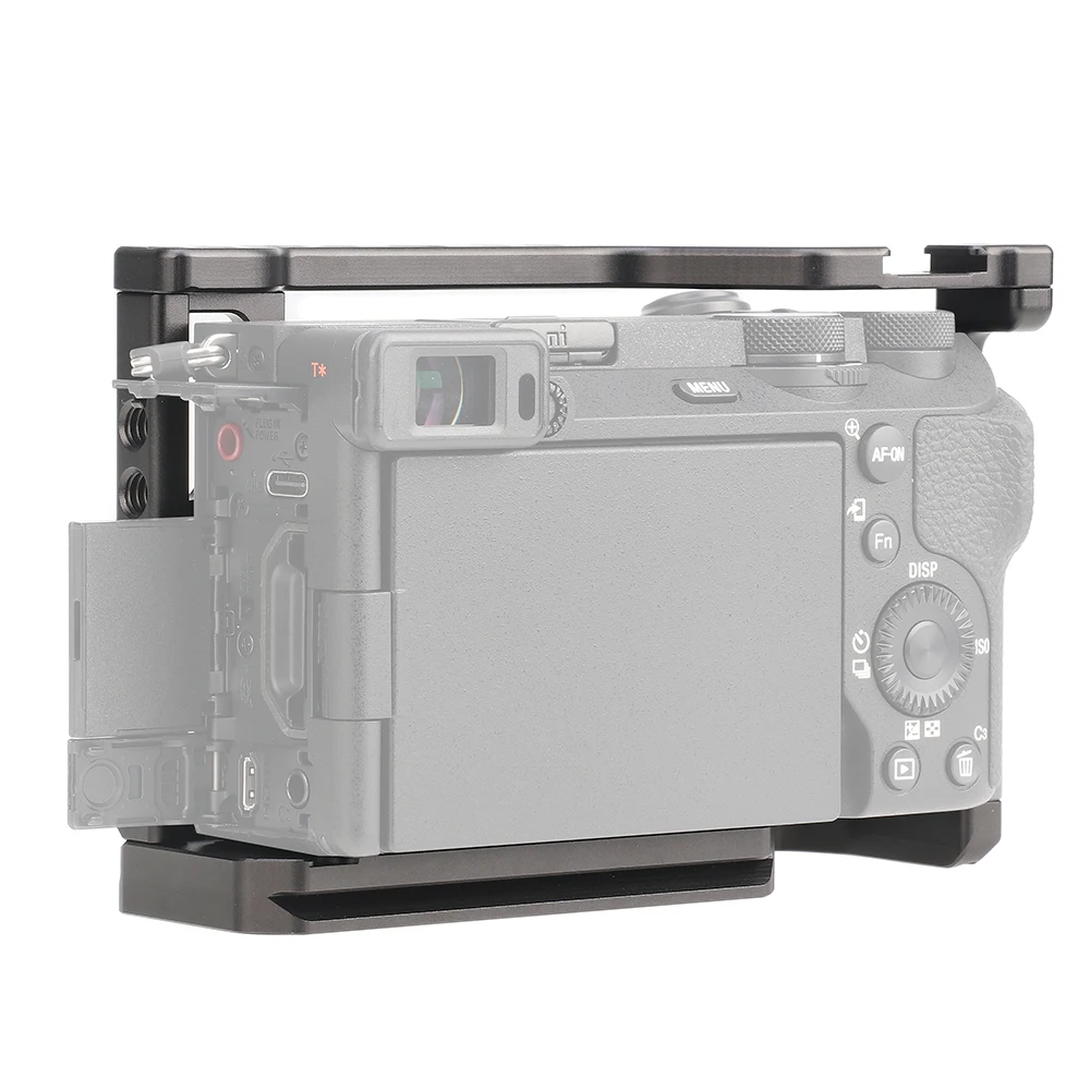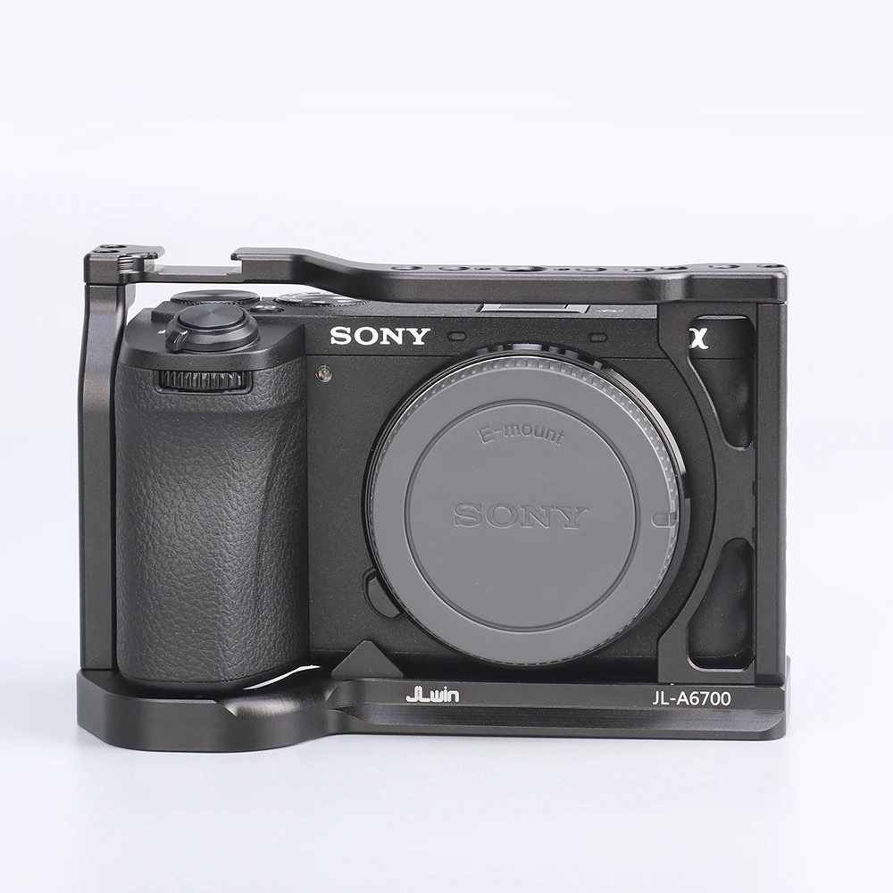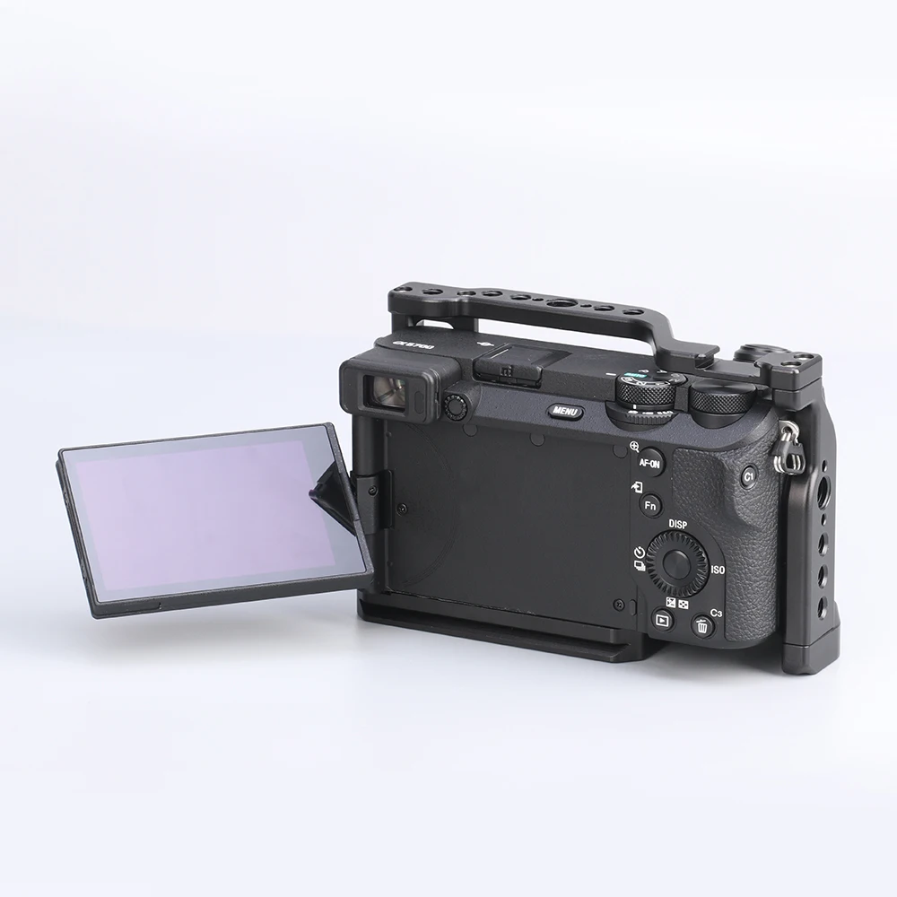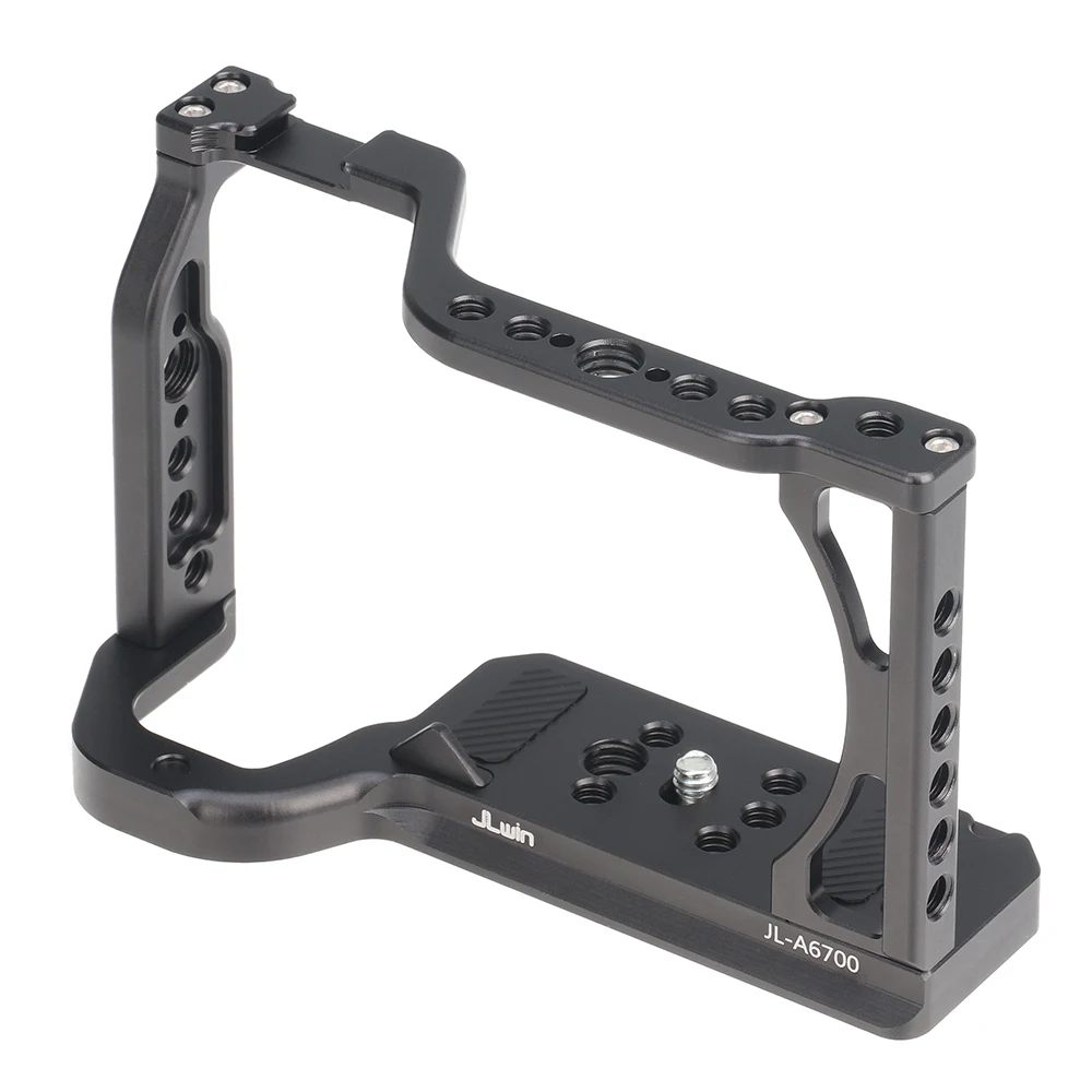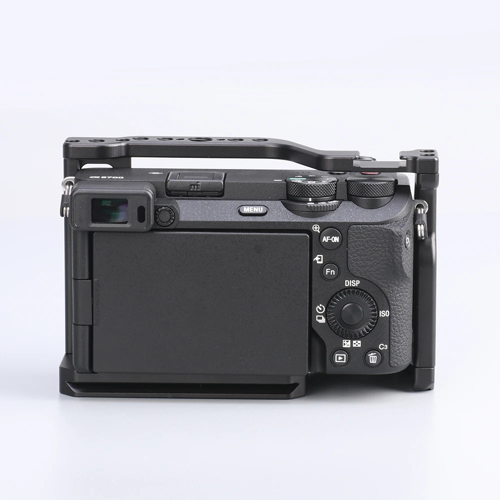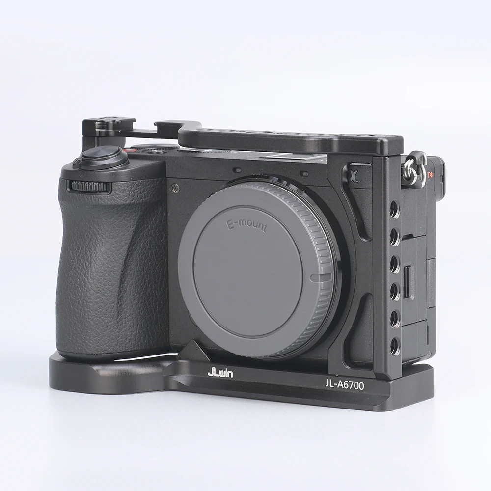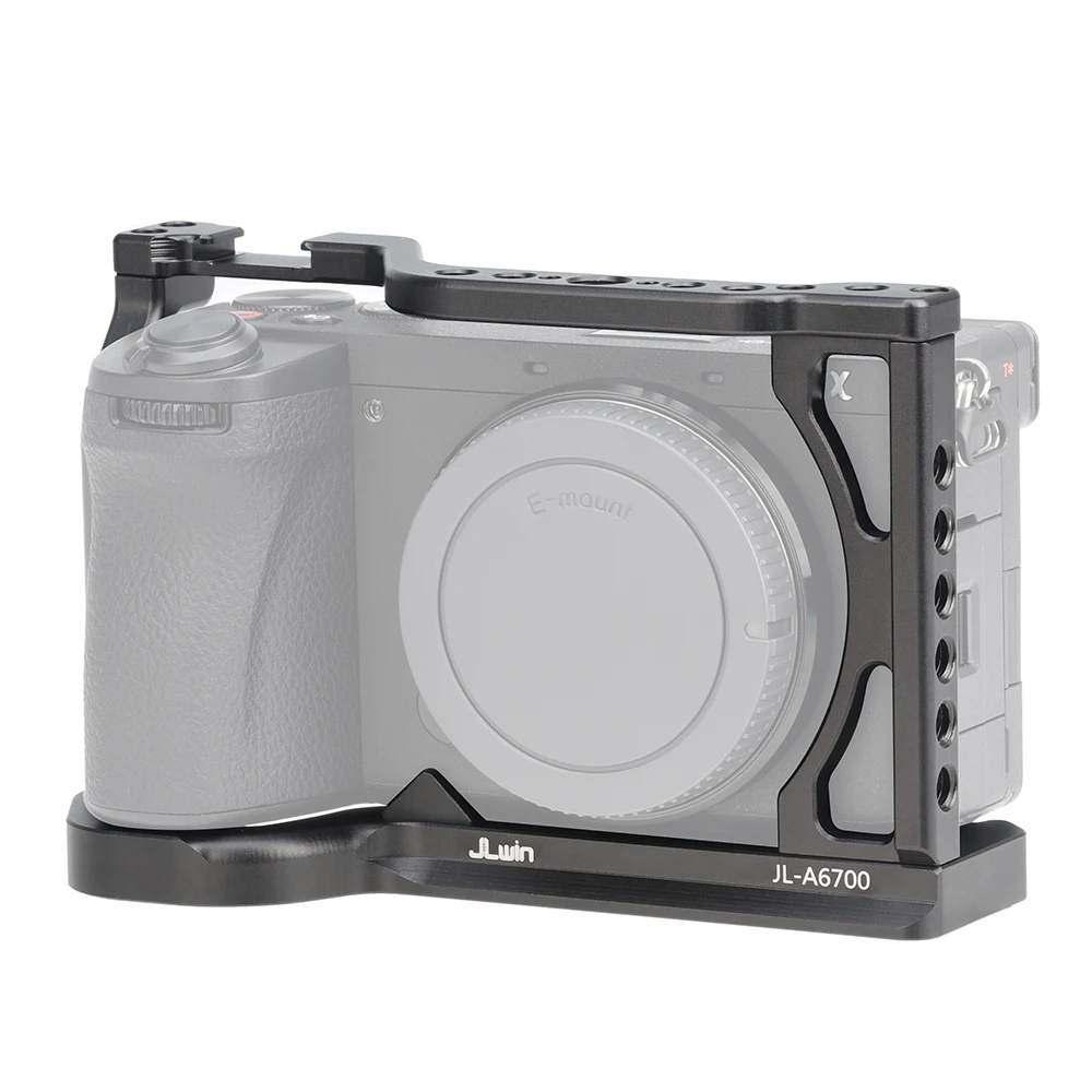 Aluminum Camera Cage is specifically designed for Sony A6700 Camera. It is a full cage which is lightweight and perfectly form-fitting the camera. It is equipped with multiple 1/4" -20 and 3/8" -16 threaded holes, ARRl locating hole and cold shoe for accessories mounting.