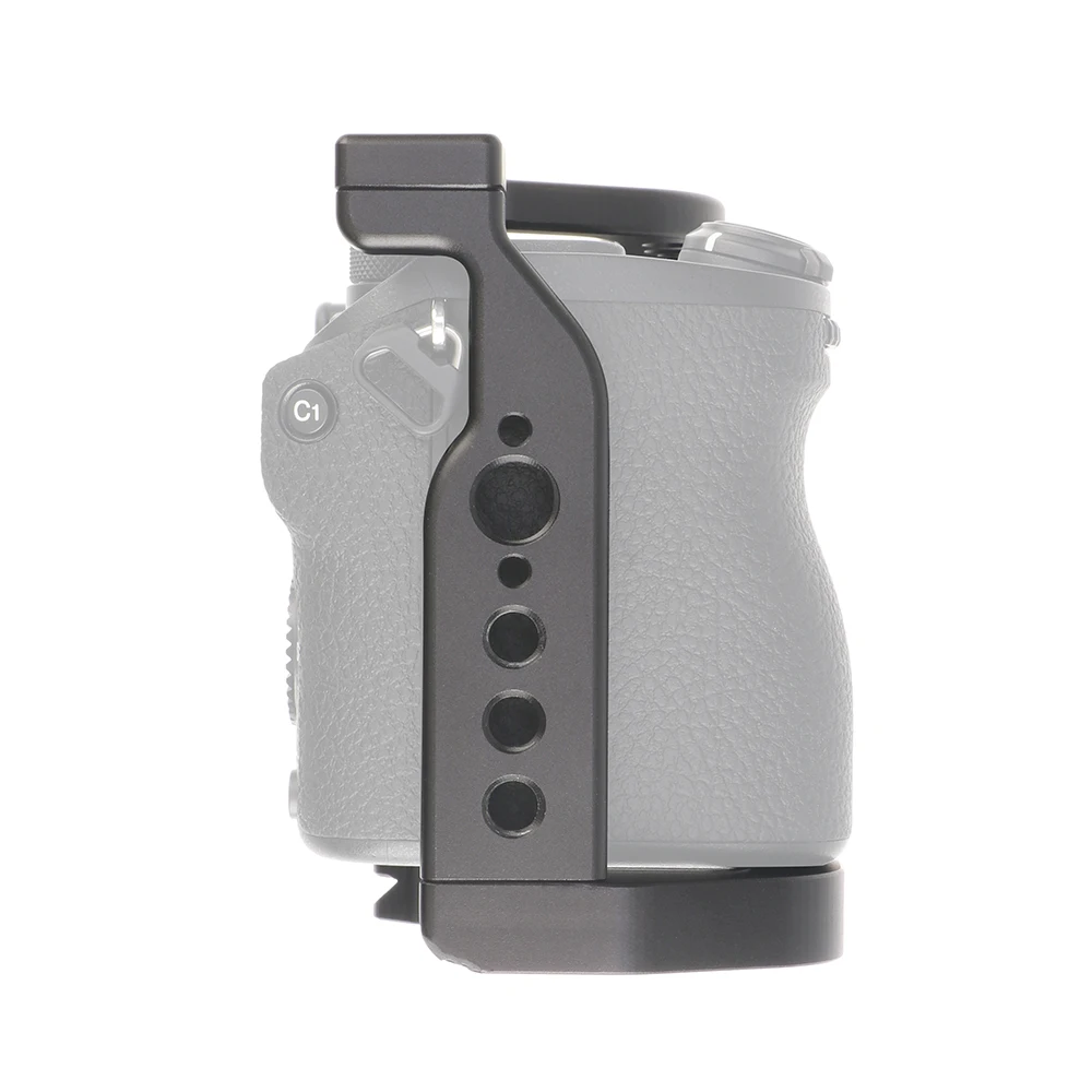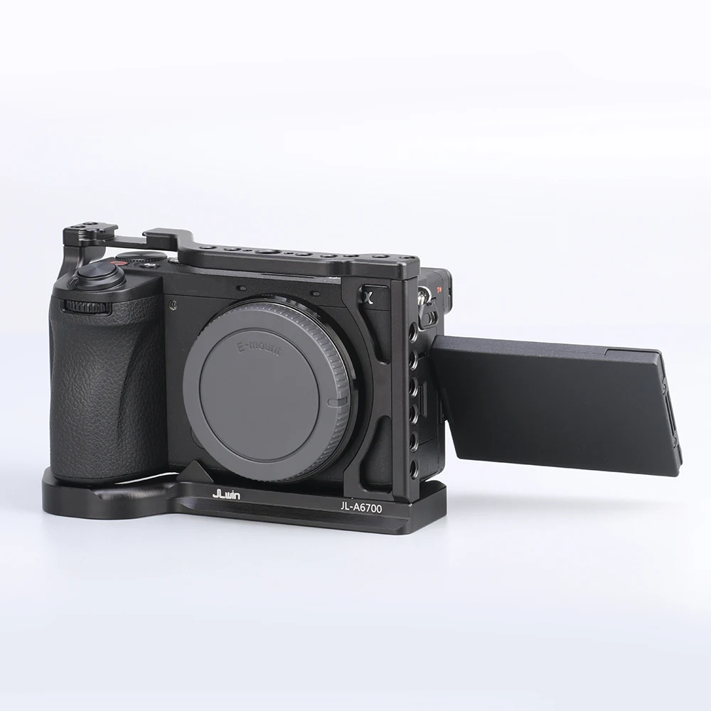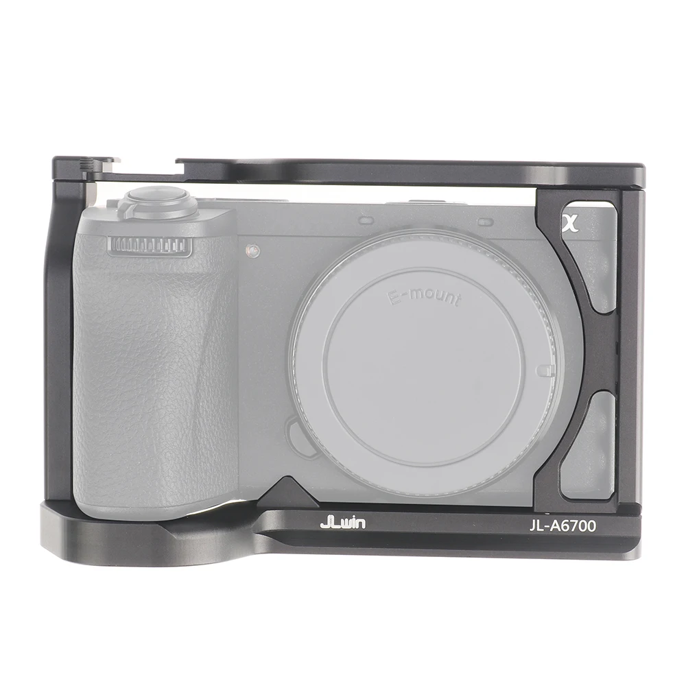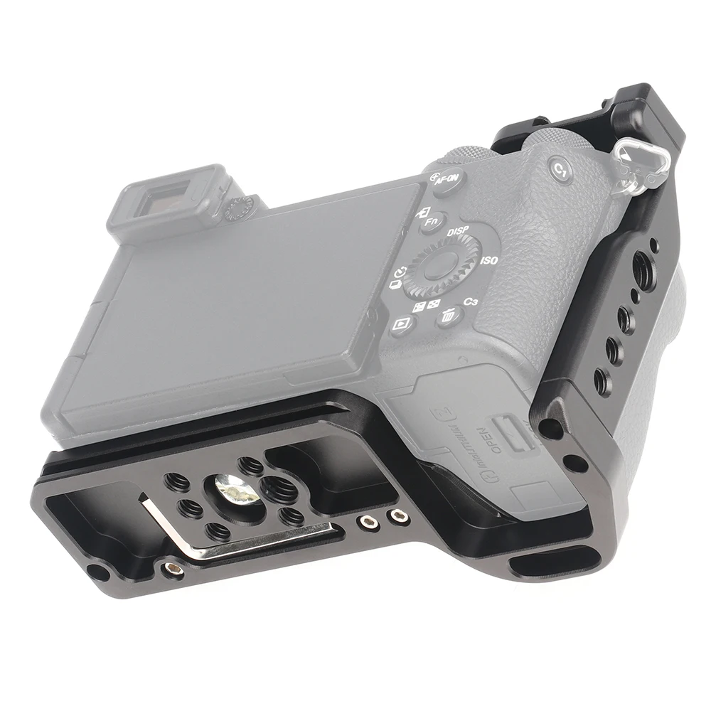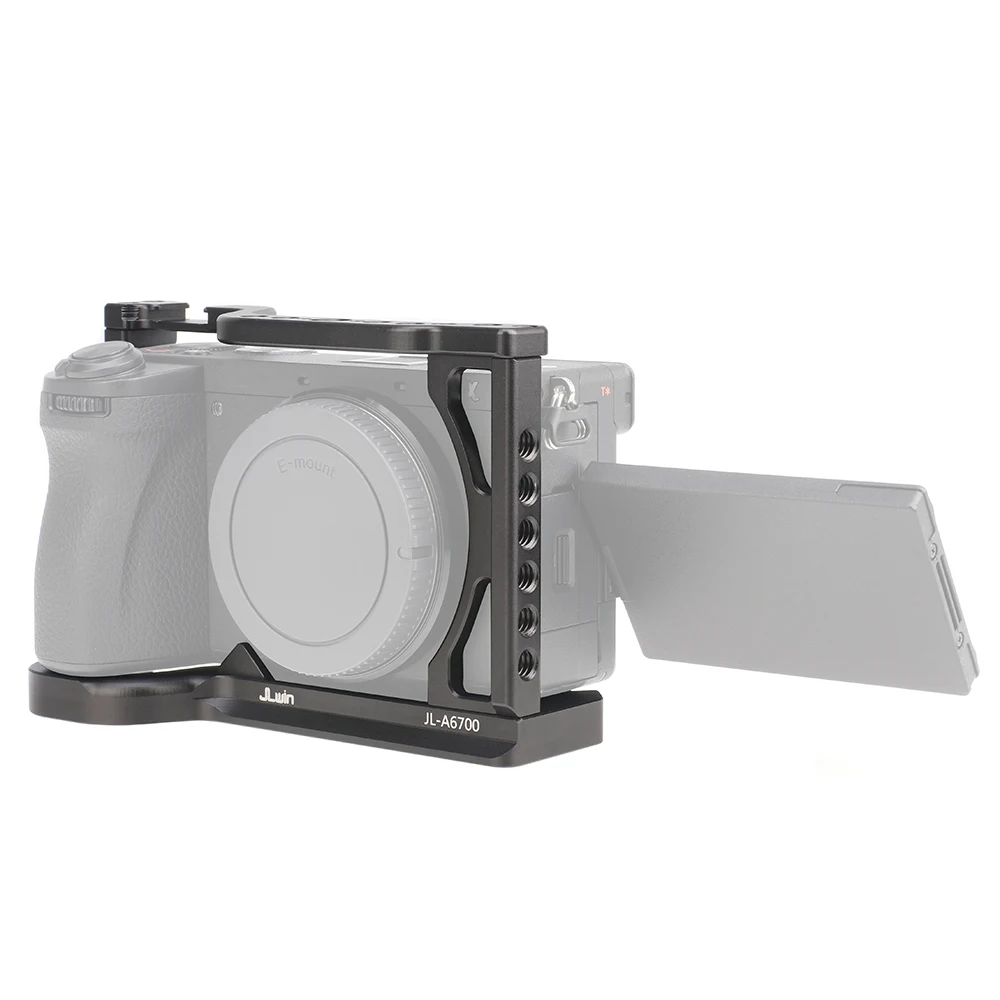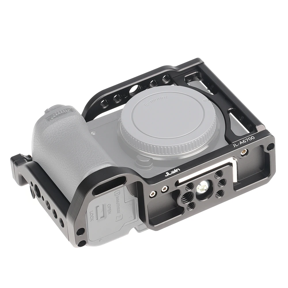 Aluminum Camera Cage is specifically designed for Sony A6700 Camera. It is a full cage which is lightweight and perfectly form-fitting the camera. It is equipped with multiple 1/4" -20 and 3/8" -16 threaded holes, ARRl locating hole and cold shoe for accessories mounting.