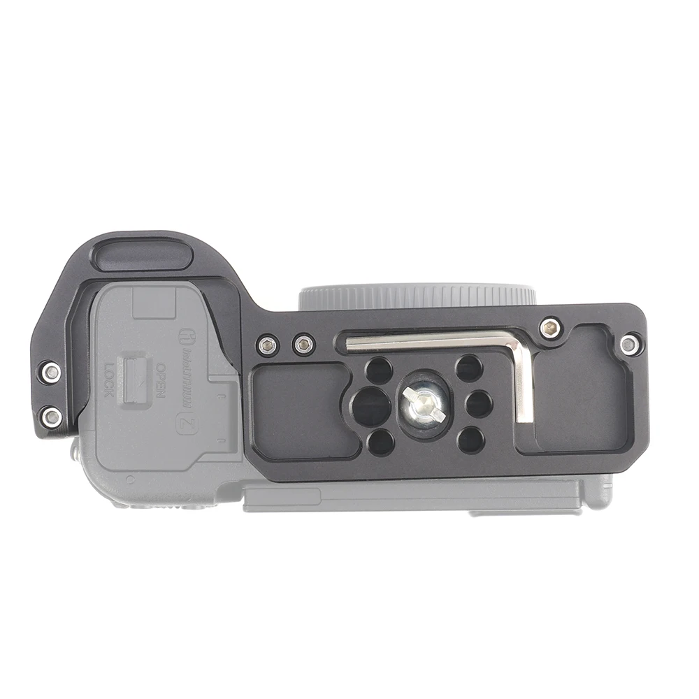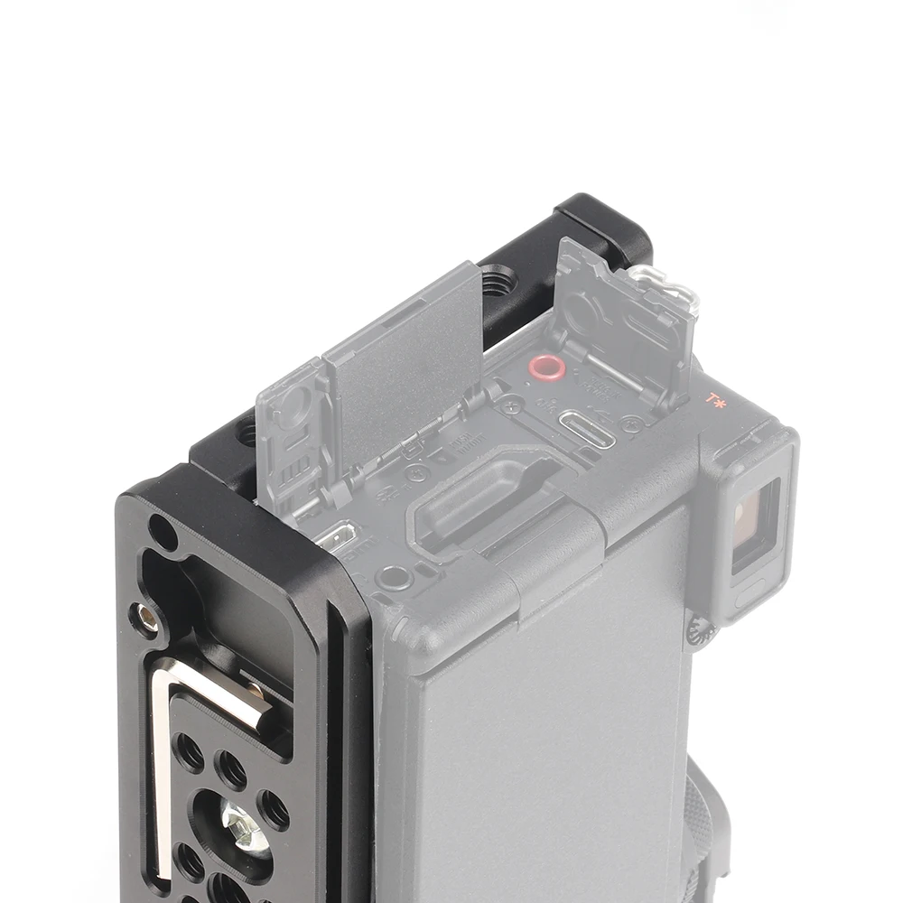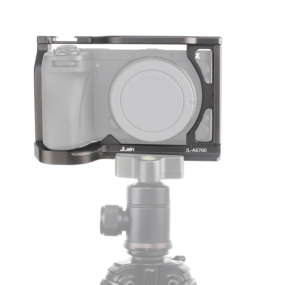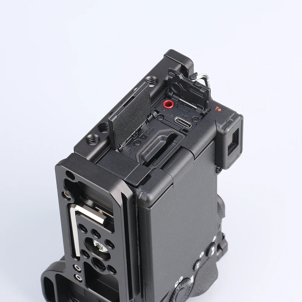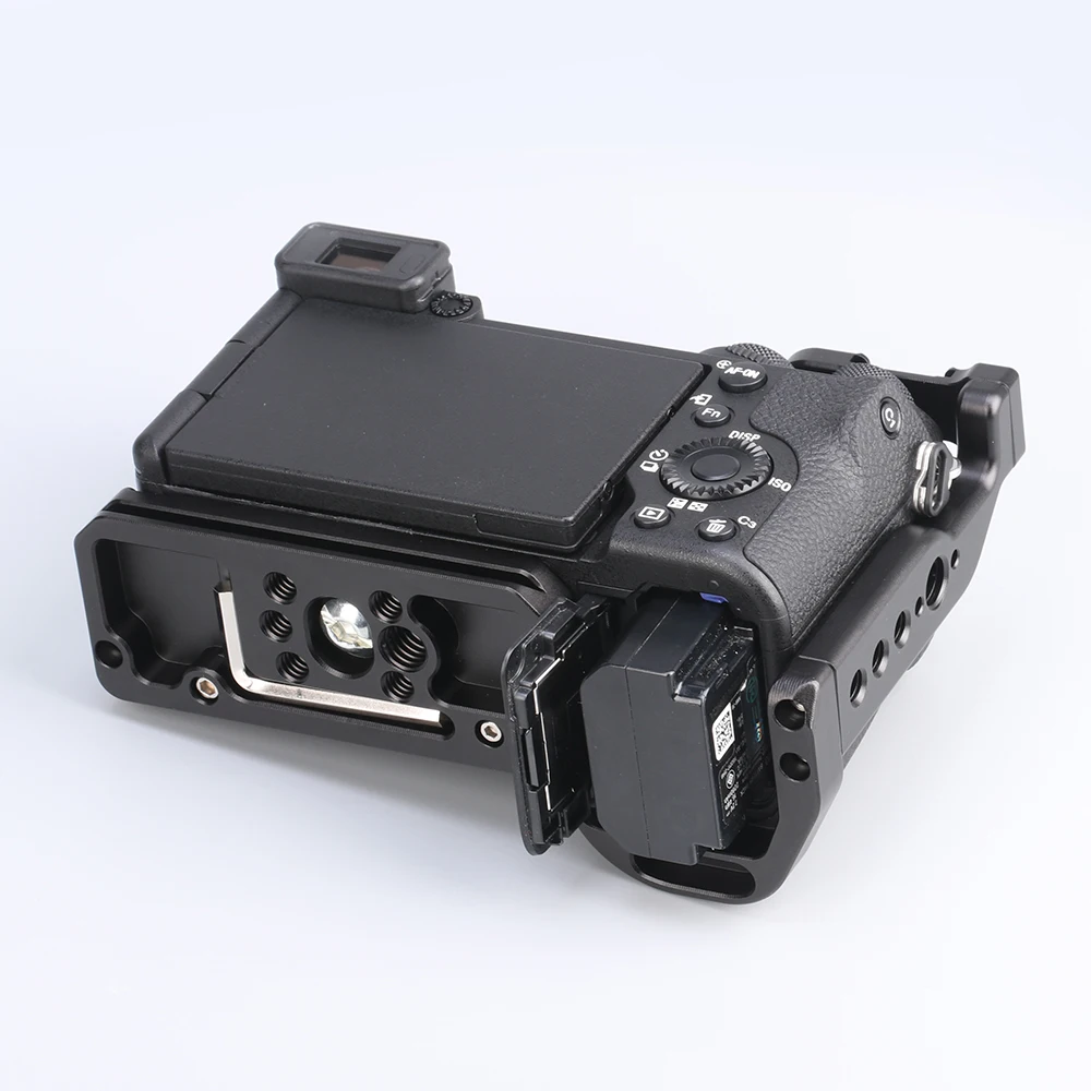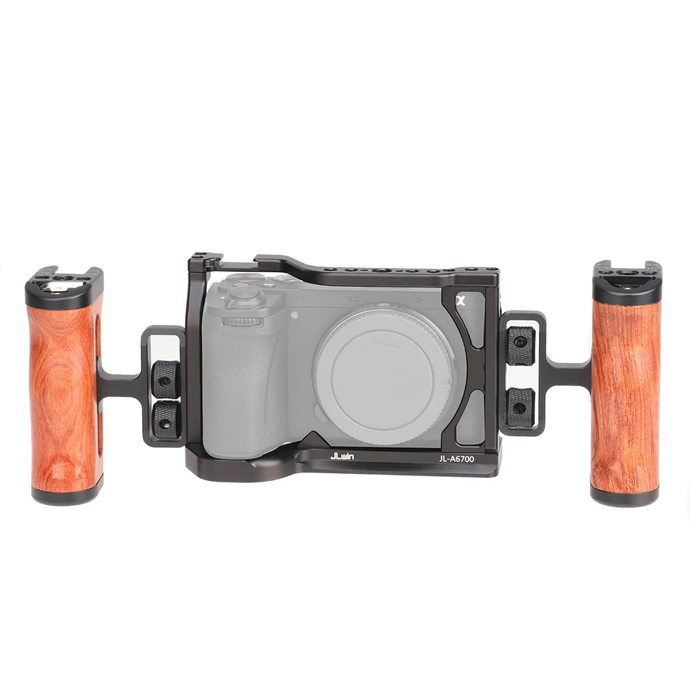 Aluminum Camera Cage is specifically designed for Sony A6700 Camera. It is a full cage which is lightweight and perfectly form-fitting the camera. It is equipped with multiple 1/4" -20 and 3/8" -16 threaded holes, ARRl locating hole and cold shoe for accessories mounting.
