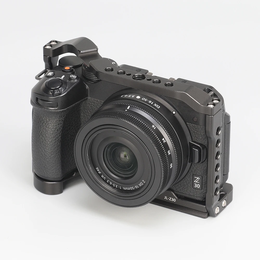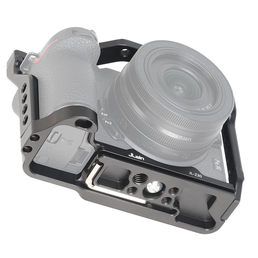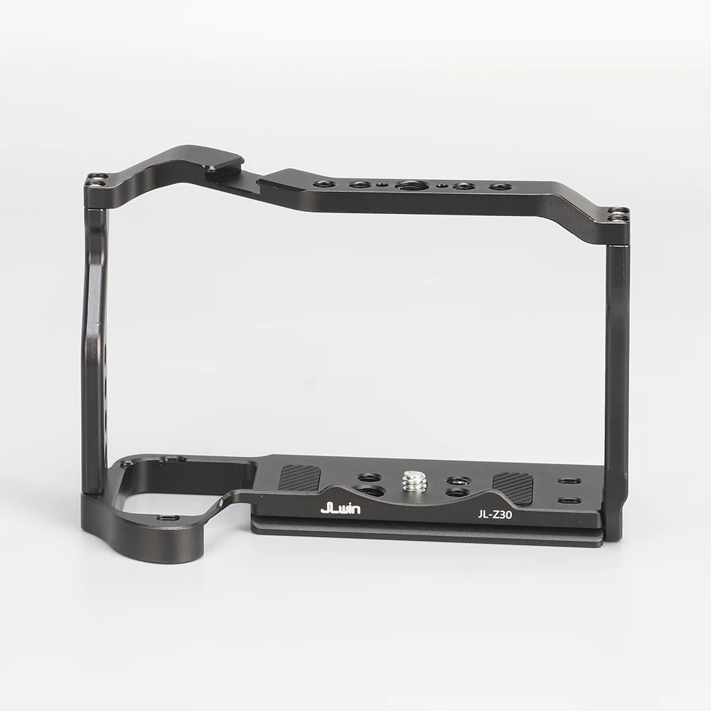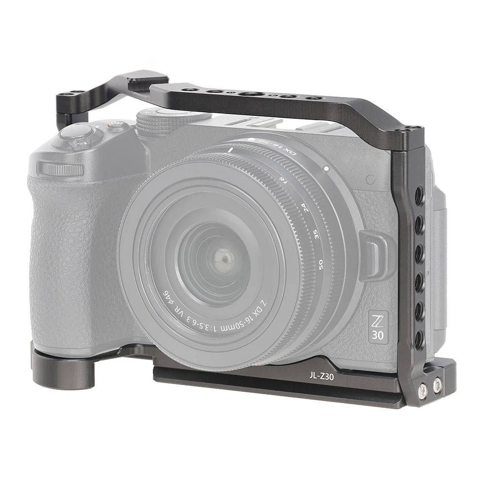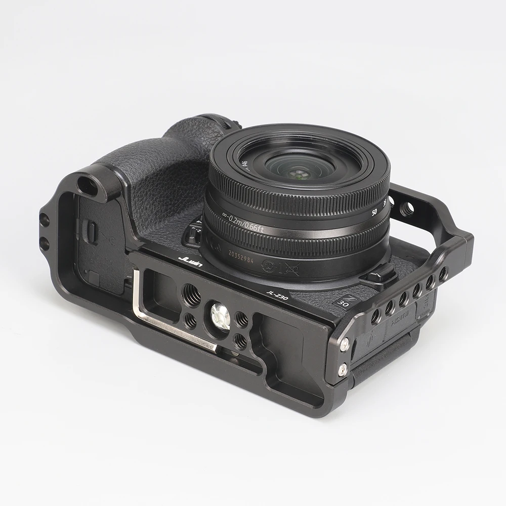 Aluminum Camera Cage is specifically designed for Nikon Z30 Camera. It is a full cage which is lightweight and perfectly form-fitting the camera. It is equipped with multiple 1/4" -20 and 3/8" -16 threaded holes, ARRl locating hole and cold shoe for accessories mounting.