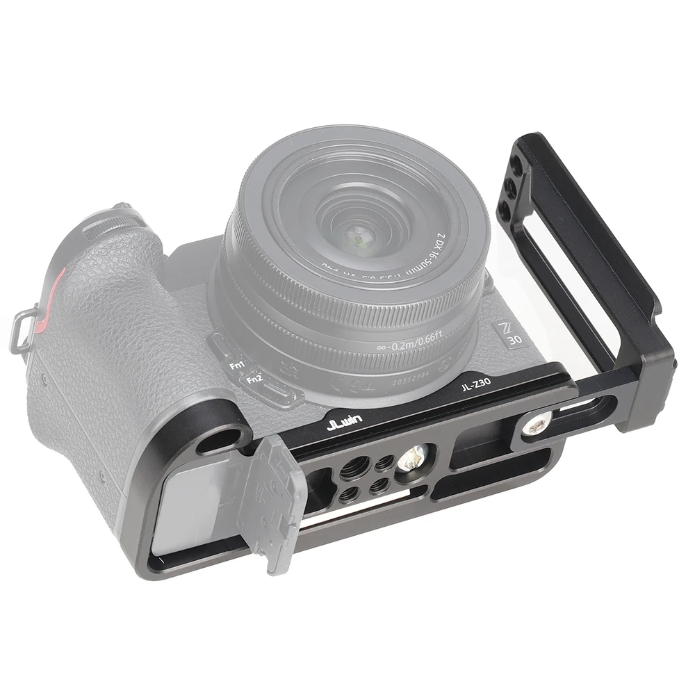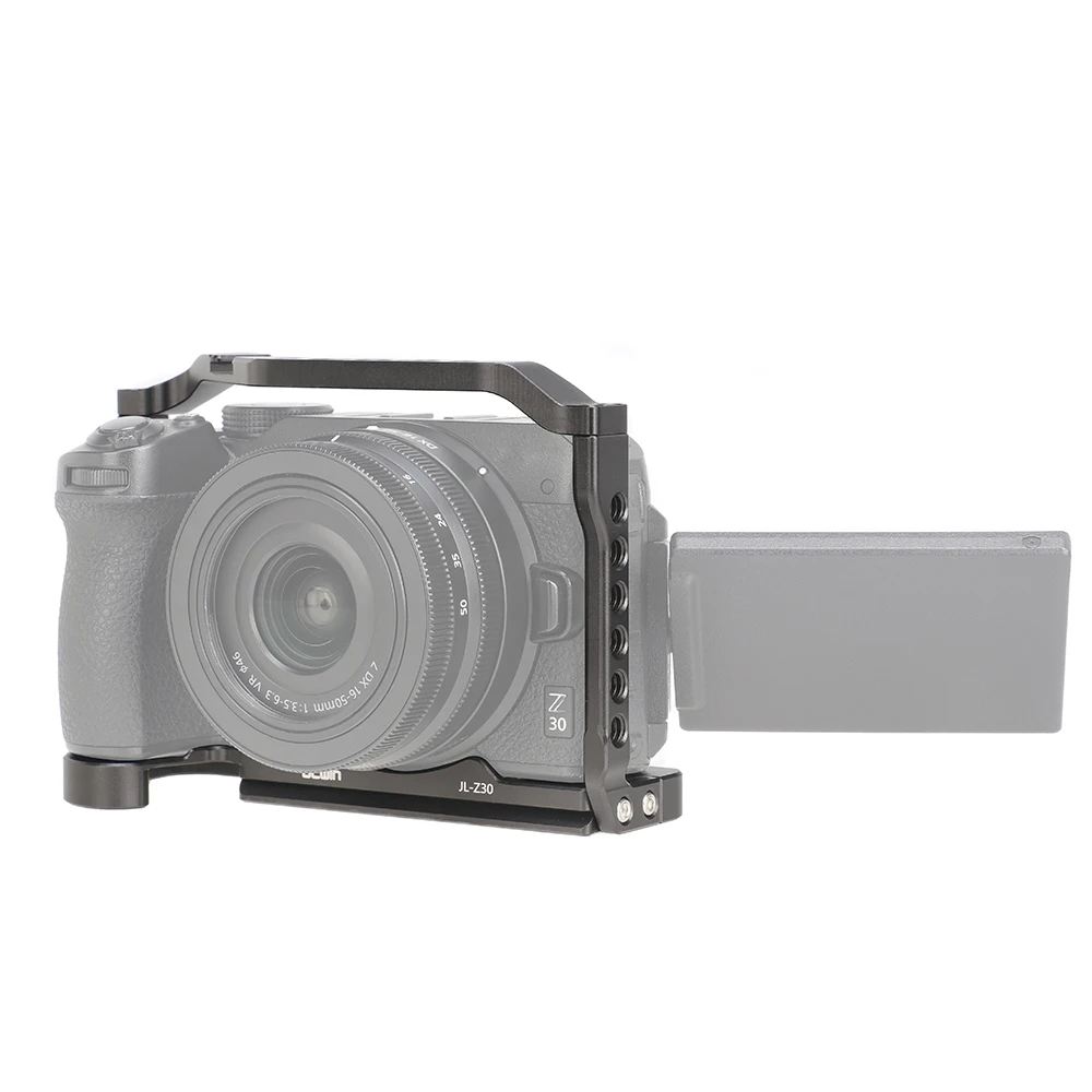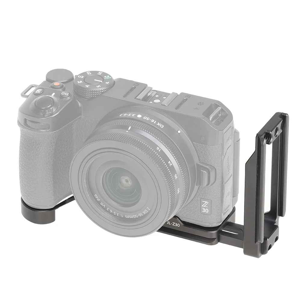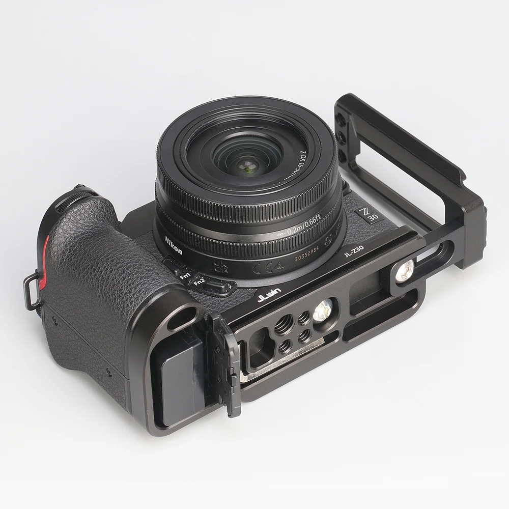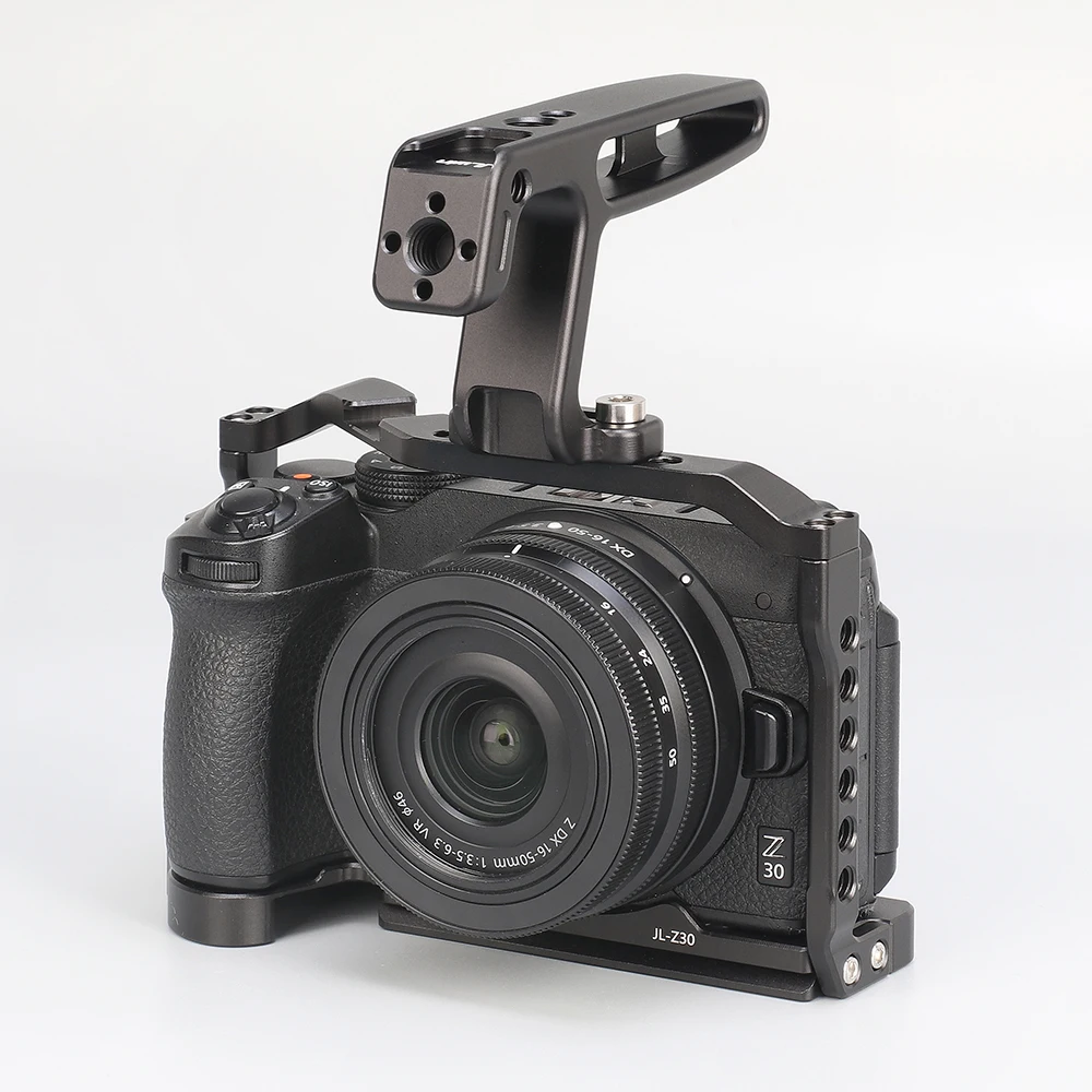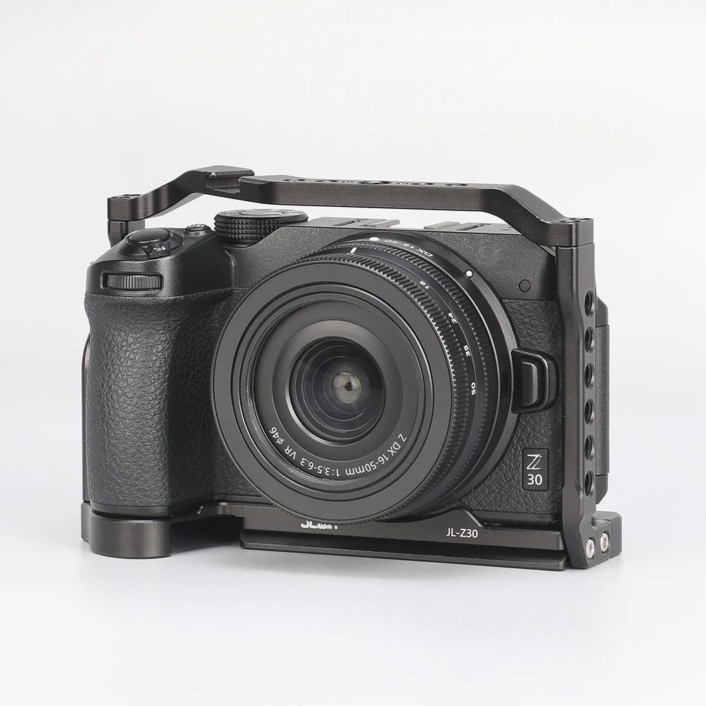 Aluminum Camera Cage is specifically designed for Nikon Z30 Camera. It is a full cage which is lightweight and perfectly form-fitting the camera. It is equipped with multiple 1/4" -20 and 3/8" -16 threaded holes, ARRl locating hole and cold shoe for accessories mounting.