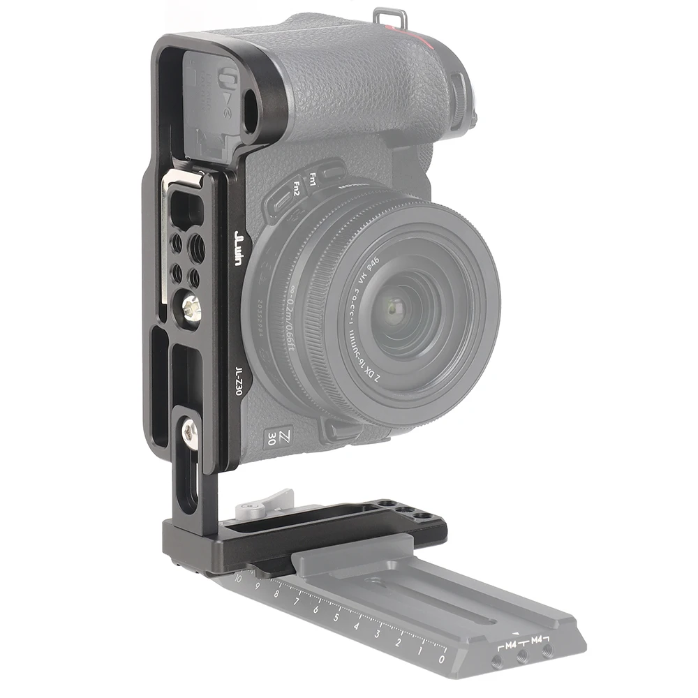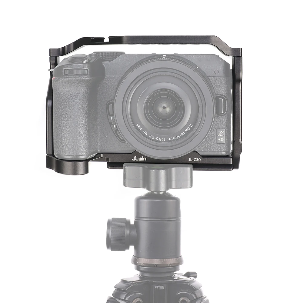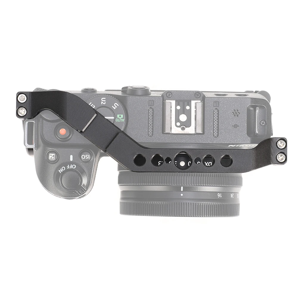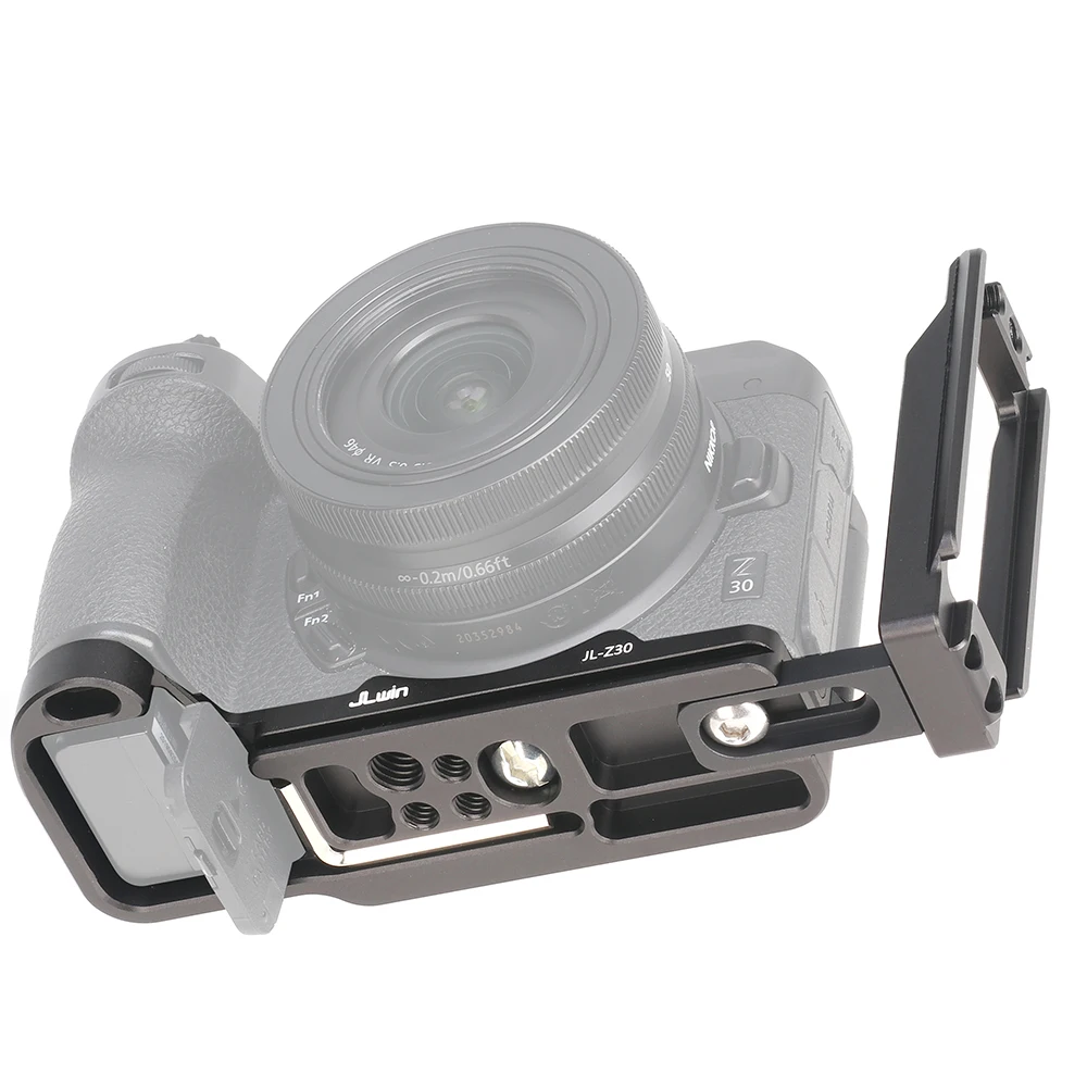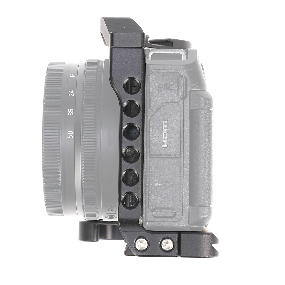 Aluminum Camera Cage is specifically designed for Nikon Z30 Camera. It is a full cage which is lightweight and perfectly form-fitting the camera. It is equipped with multiple 1/4" -20 and 3/8" -16 threaded holes, ARRl locating hole and cold shoe for accessories mounting.