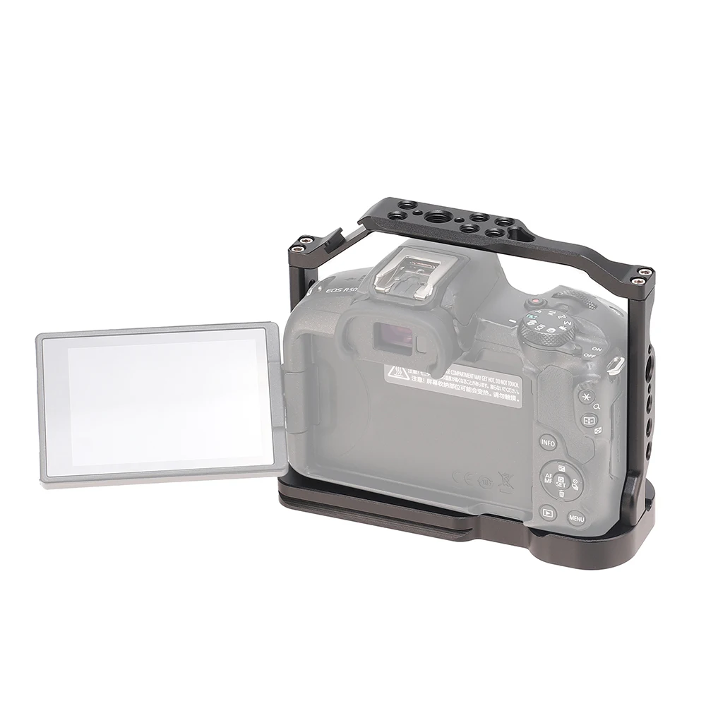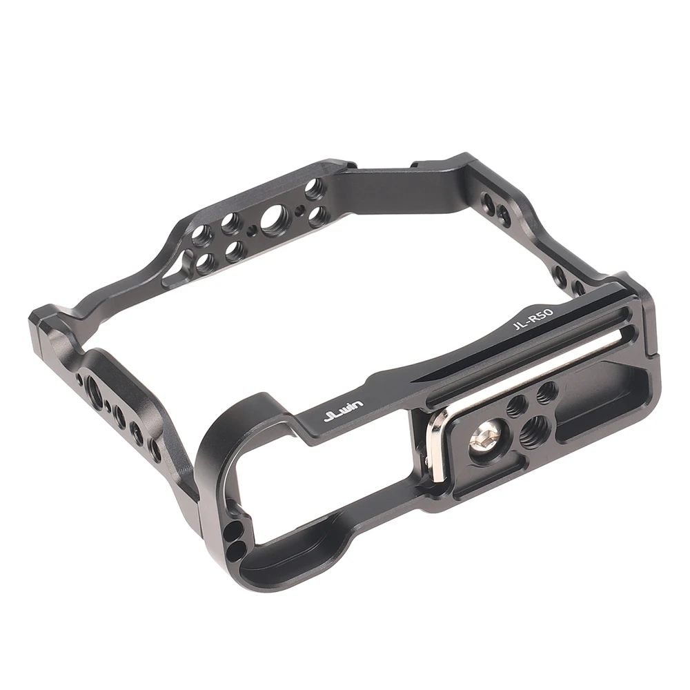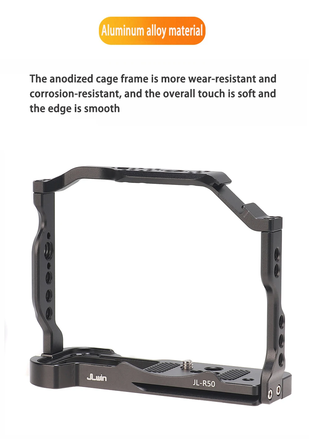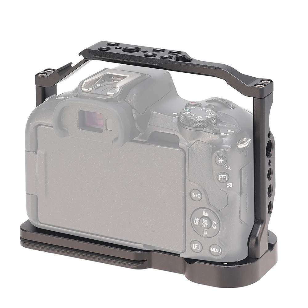 Aluminum Camera Cage is specifically designed for Canon EOS R50 Camera. It is a full cage which is lightweight and perfectly form-fitting the camera. It is equipped with multiple 1/4" -20 and 3/8" -16 threaded holes, ARRl locating hole and cold shoe for accessories mounting.