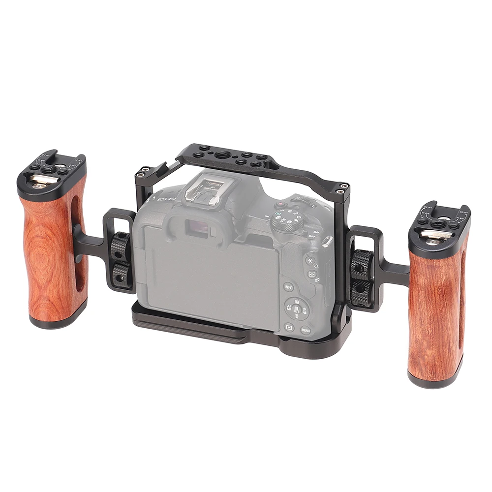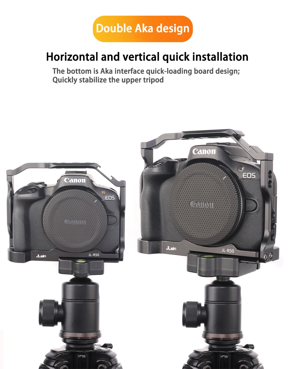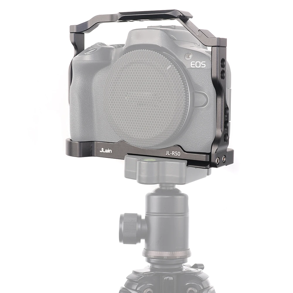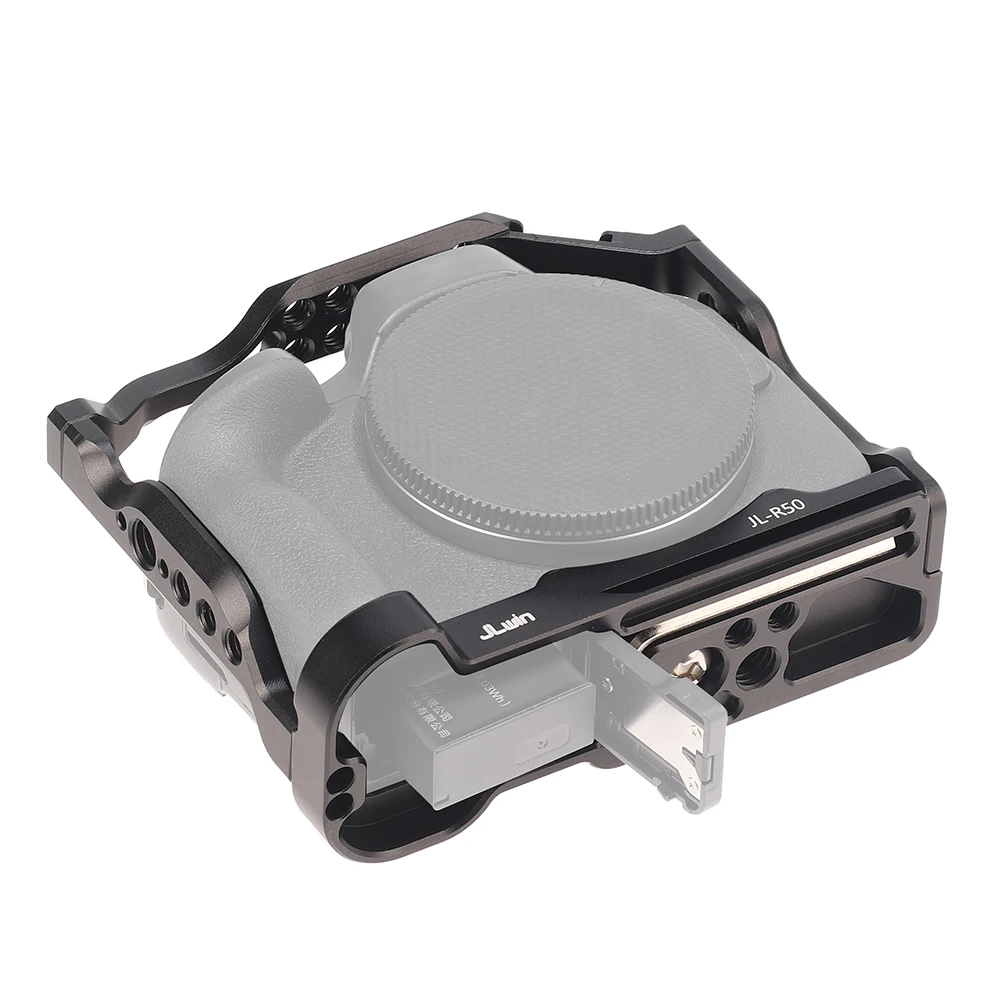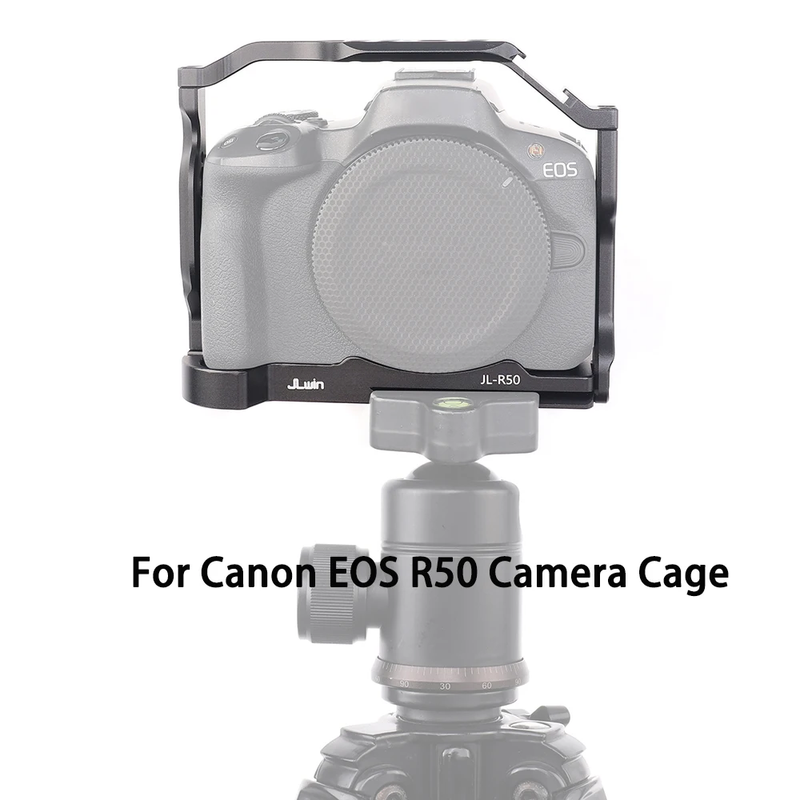 Aluminum Camera Cage is specifically designed for Canon EOS R50 Camera. It is a full cage which is lightweight and perfectly form-fitting the camera. It is equipped with multiple 1/4" -20 and 3/8" -16 threaded holes, ARRl locating hole and cold shoe for accessories mounting.