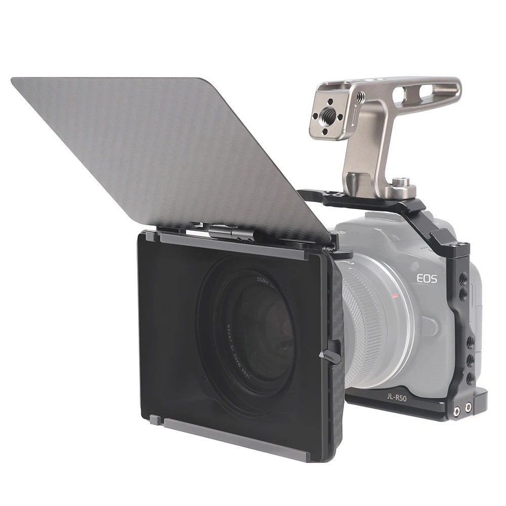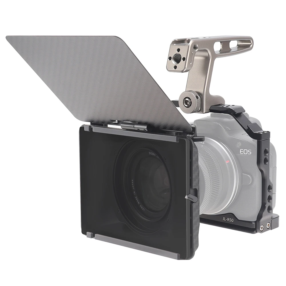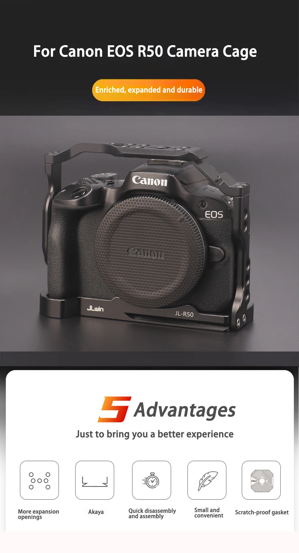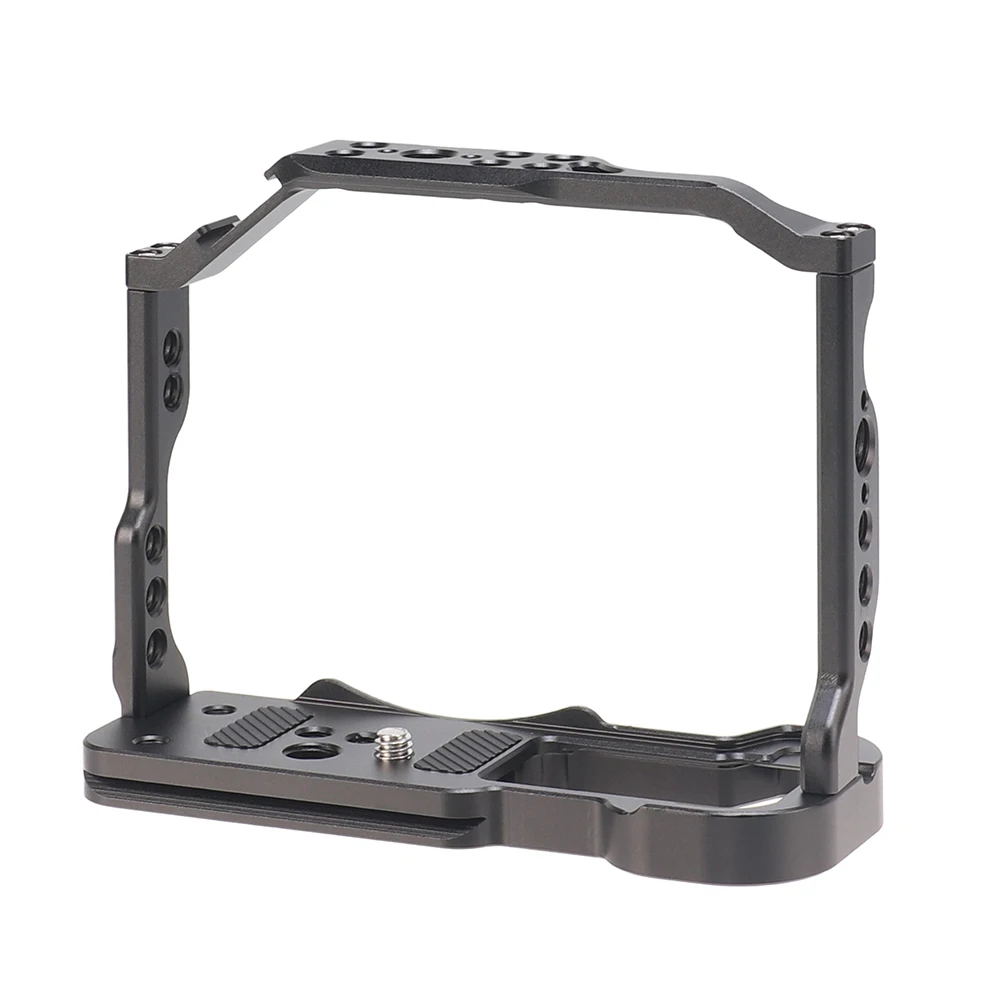Aluminum Camera Cage is specifically designed for Canon EOS R50 Camera. It is a full cage which is lightweight and perfectly form-fitting the camera. It is equipped with multiple 1/4" -20 and 3/8" -16 threaded holes, ARRl locating hole and cold shoe for accessories mounting.