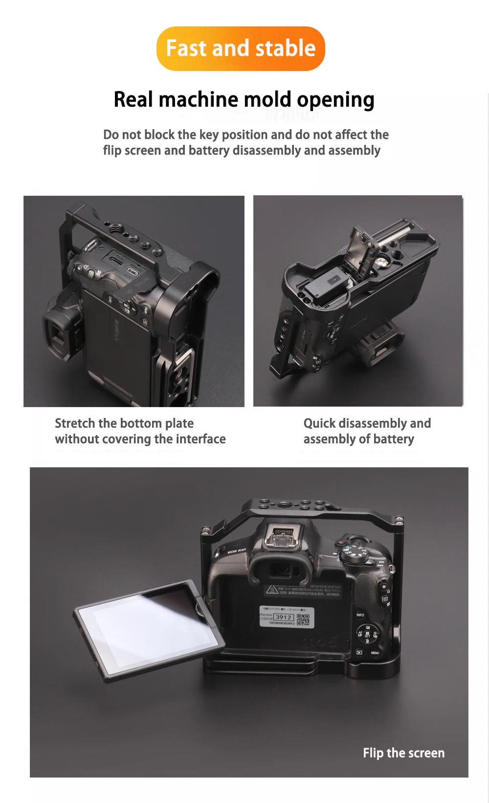 1. It is the metal cage for DSLR cameras, the real machine is unobstructed, and the button position is not blocked during use, and the flip screen and battery disassembly and assembly are not blocked.