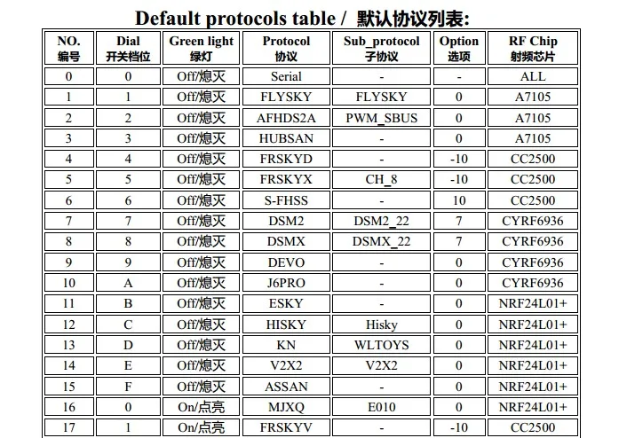 In PPM mode, there are 31 different protocols corresponding to the 16 positions of the rotary coding switch (protocol 0 is reserved for serial port mode). Please refer to the list on the previous page of the manual for the correspondence between the two.