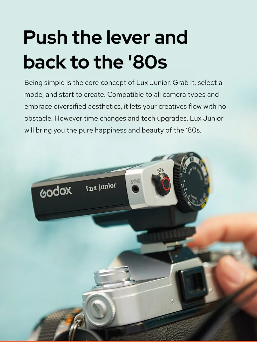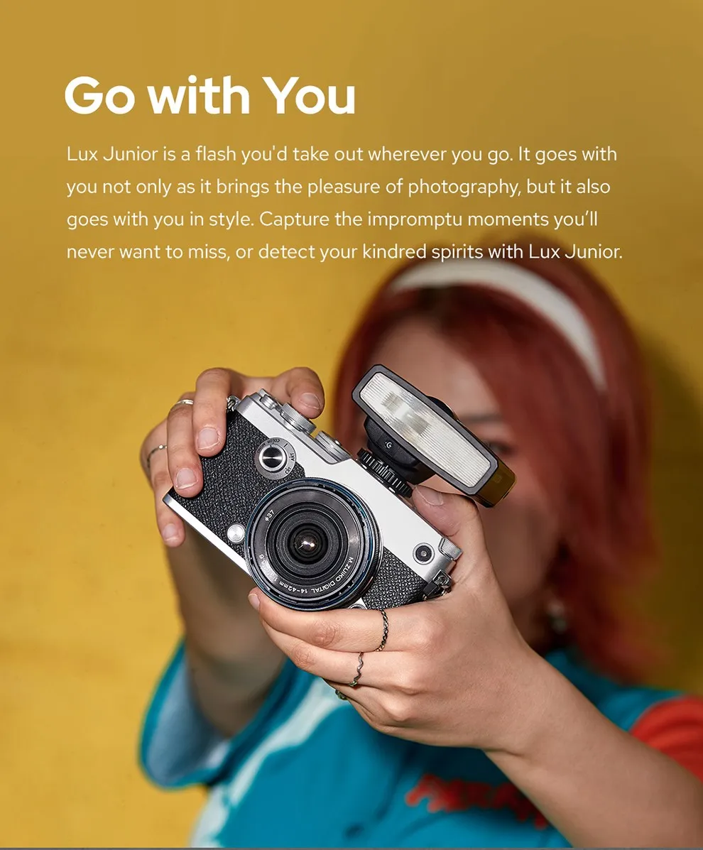 Lux Junior is a flash you are eager to take out wherever you go. It goes with you not only as it brings the pure pleasure of photography but also goes with you in style. Capture your impromptu moments or detect your kindred spirits with Lux Junior.