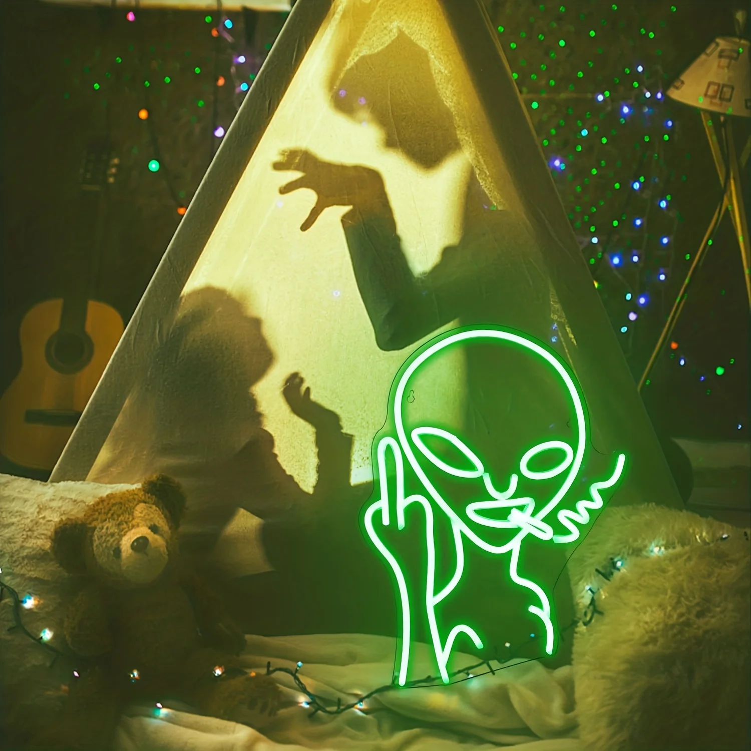 * Alien Bedroom Decor: Are you looking to add a little brightness and interesting thing to your room or office, the alien smoker shape neon sign can deliver just the right amount of luminosity and add a fun atmosphere.