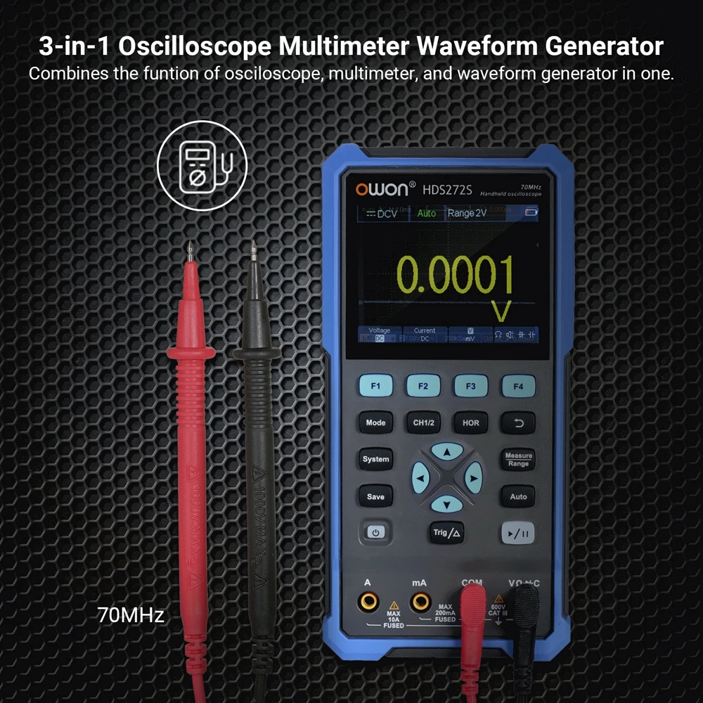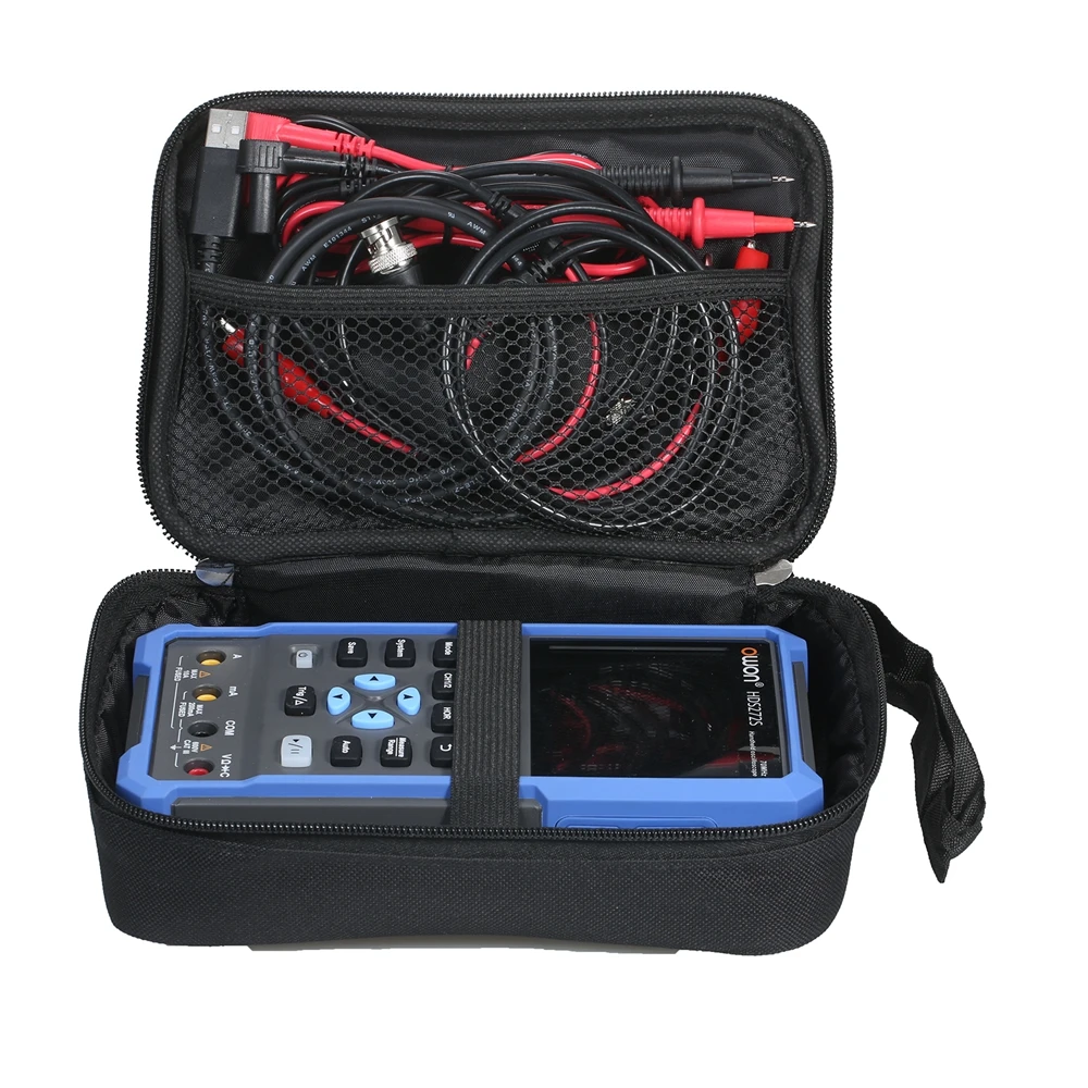Versatile Handheld Test Instrument -- Handheld Oscilloscope Function + Digital Multimeter Function + Waveform Generator, 3-in-1 integrated multifunctional handheld test instrument. One key switch easy to operation, compact size with stand bracket suit for outdoor maintenance, rapod on-site measurement, automobile maintenance, power detection, etc.