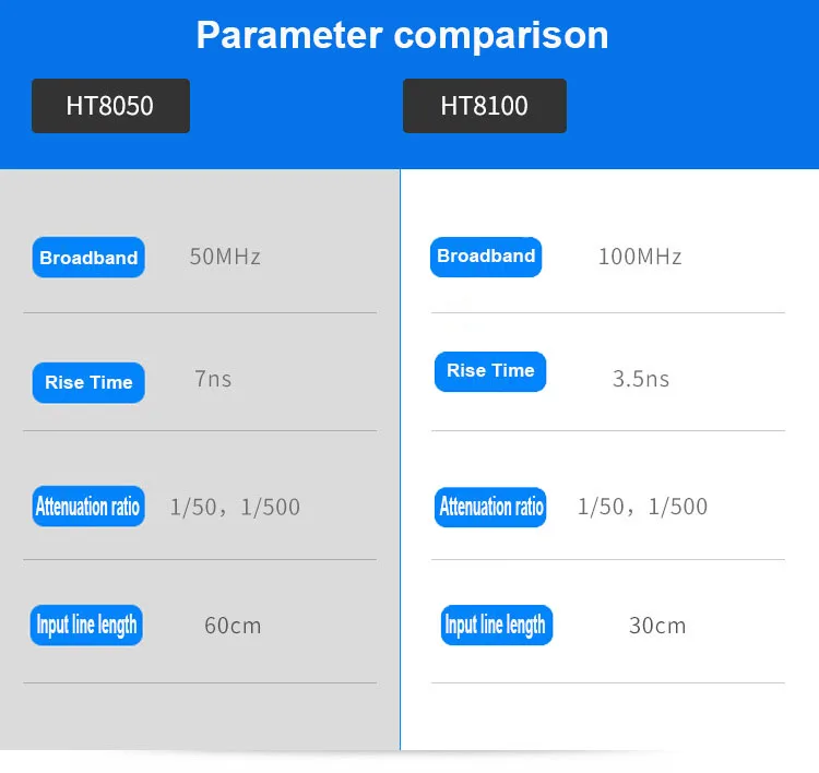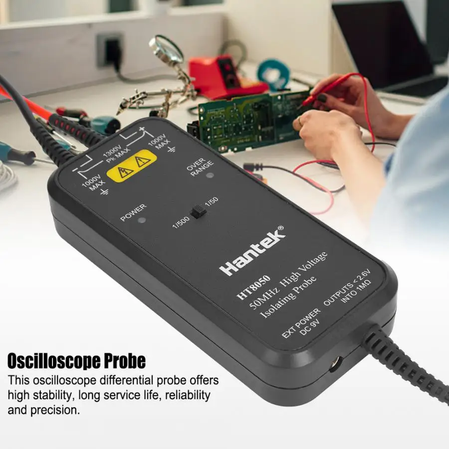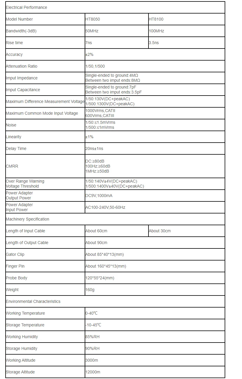 The HT8050/HT8100 oscilloscope high-voltage differential probe has stability, reliability and accuracy.