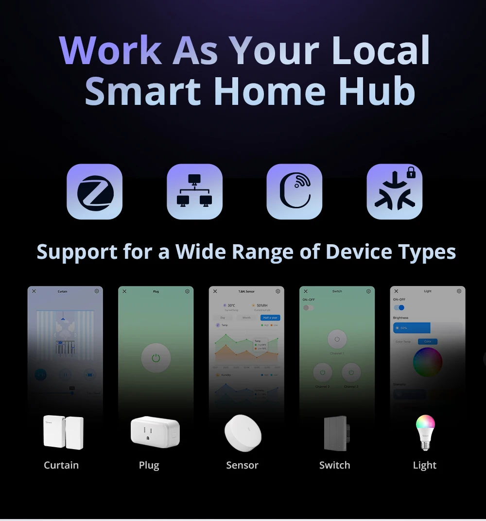 Support all SONOFF Zigbee DIY smart switches, plugs, sensors, curtain motors, and other devices. Create a comprehensive SONOFF Zigbee ecosystem.