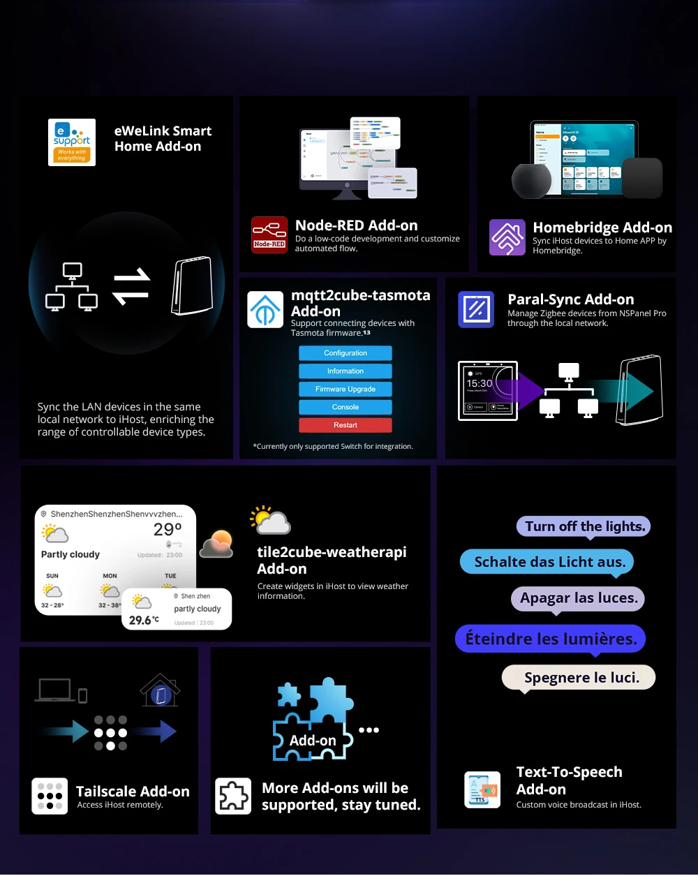 iHost supports adding devices through Zigbee, L AN, eWeLink Remote and Matter, allowing you to centralize smart devices at home within iHost