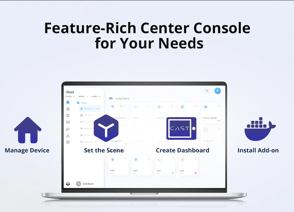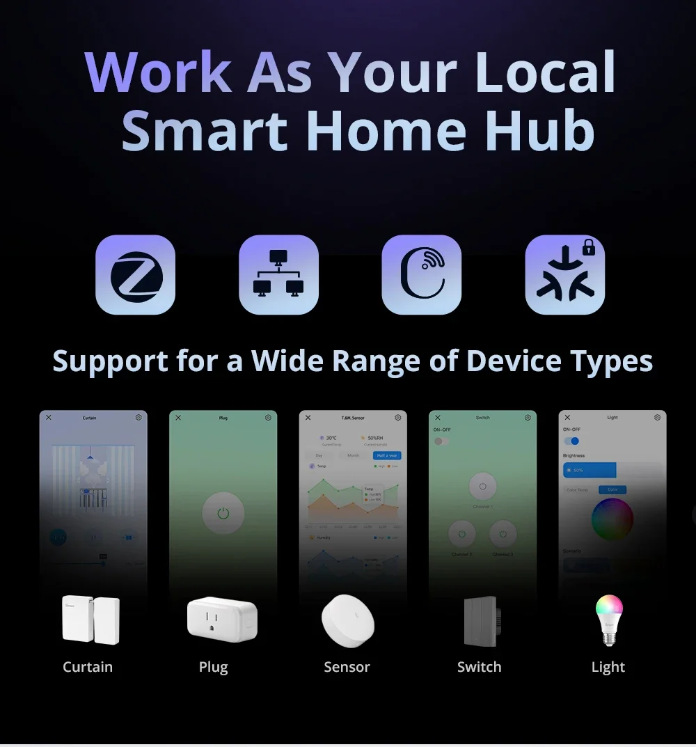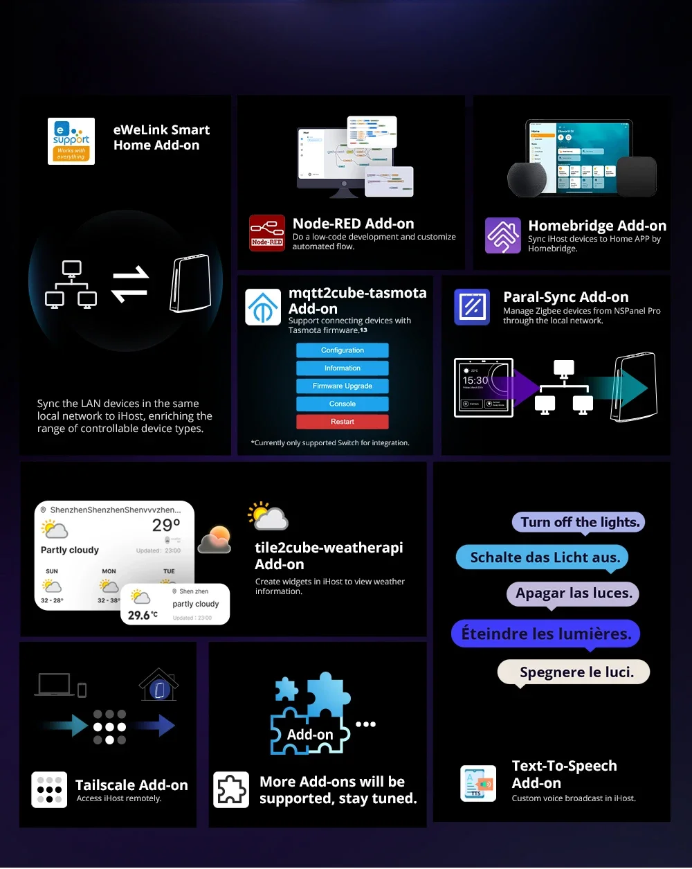 SONOFF wants to provide a local control center to make your home automation more fast, reliable and secure, with this vision, iHost Smart Home Hub was born, it allows you locally control devices and set smart scenes in a local control console via LAN. Besides, it supports various add-on to expand more possibilities.