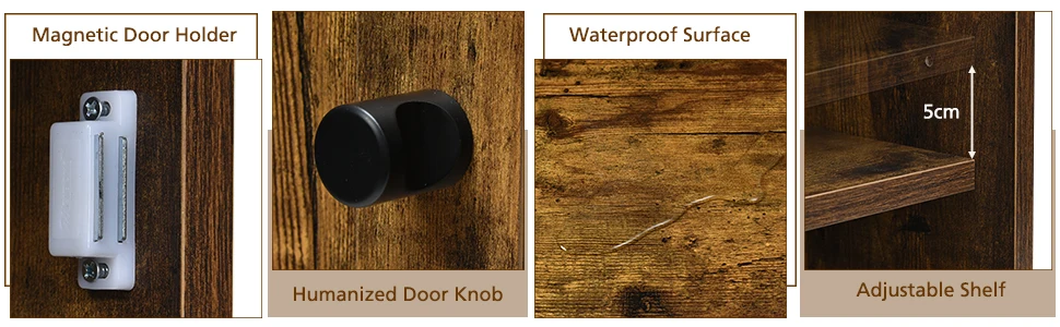Made of high quality engineered wood for long lasting use Sturdy metal frame provides great stability and weight capacity Spacious tabletop for potted plants, aromatherapy and photo frames 2-tier cabinet and 3 side open shelves offer large storage space Adjustable middle shelf with 3 heights to meet different storage needs Exquisite metal knob allows you to easily open and close the door Magnetic door holder helps to fix the door better and without noise Suitable for living room, kitchen, bathroom, entryway, bedroom, etc Simple and industrial style add a touch of chic to your home Smooth and waterproof surface for easy cleaning Clear instruction and included tool for easy assembly