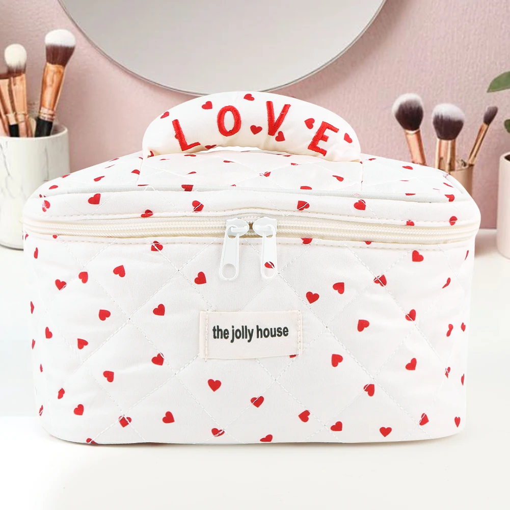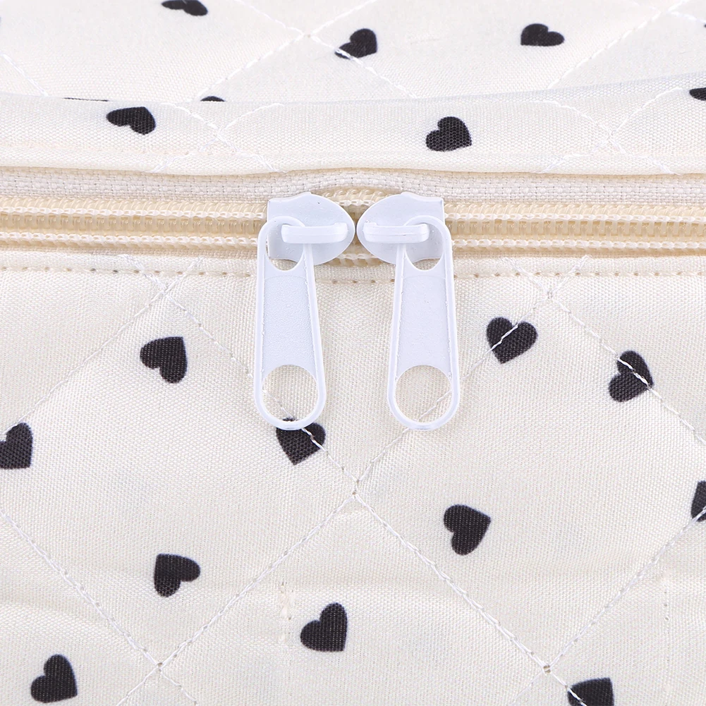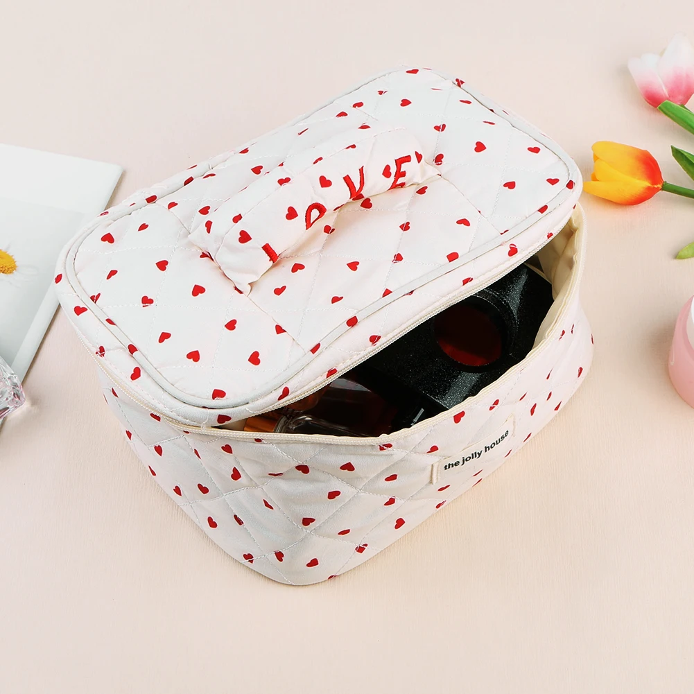 Quilted Makeup Bag Makeup Organizer Bag Large Capacity Skincare Holder Bag Cotton Heart Pattern Women Cosmetics Handbag