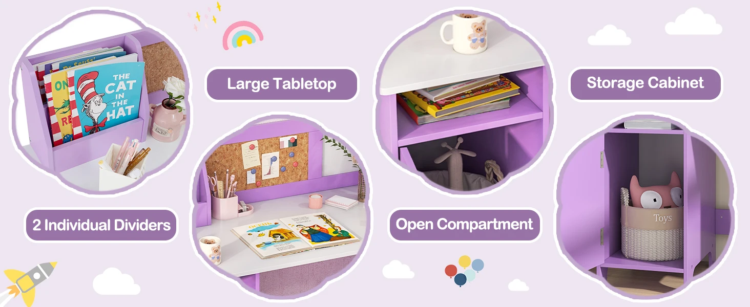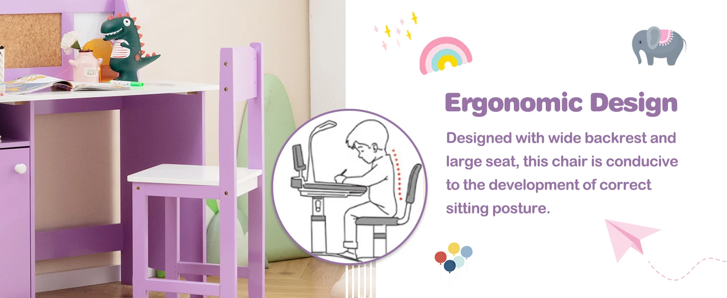 The table has 1 small bookshelf, 1 open compartment, 1 wide tabletop, and 1 single door cabinet to ensure ample storage space. Moreover, the whiteboard and bulletin board will bring your little one fun and enjoyment. The ergonomic chair with a high back allows kids to feel comfortable. When not in use, the chair can be stored under the table. The solid wood chair legs keep the chair steady and not easy to wobble. Furthermore, the smooth surface and rounded corners make the desk and chair safe to touch.