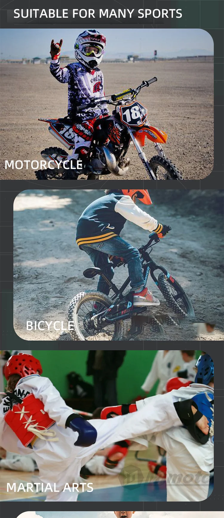 Application: Motocross, riding, cycling, skating, scooter, climbing, and much outdoor activities