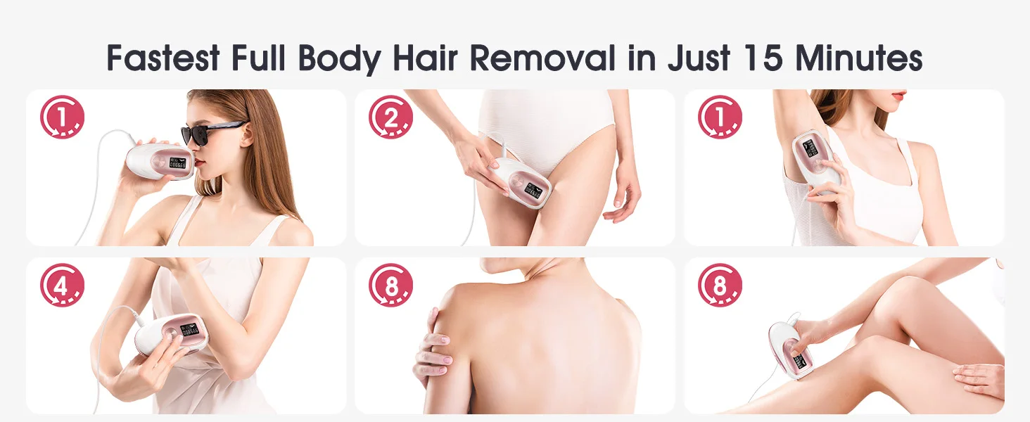 15 Mins for Full Body UseJOOYEE laser hair remover for women is perfect for full body hair removal --- upper lip, face, underarms, arms, bikini line, legs. Its ergonomic size allows you to hold it easily and enjoy effortless hair removal.