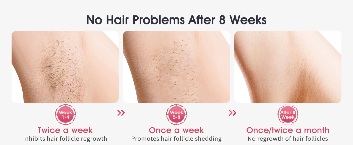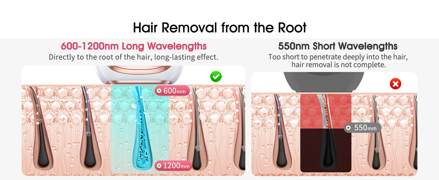 Long-Lasting IPL Hair RemovalWith Max 18J and 600-1200nm wavelengths, you can enjoy obvious reduction in 4 weeks and smooth hair-free results in 8 weeks. Use twice a week for the first 4 weeks and follow the instructions for long lasting hair removal.