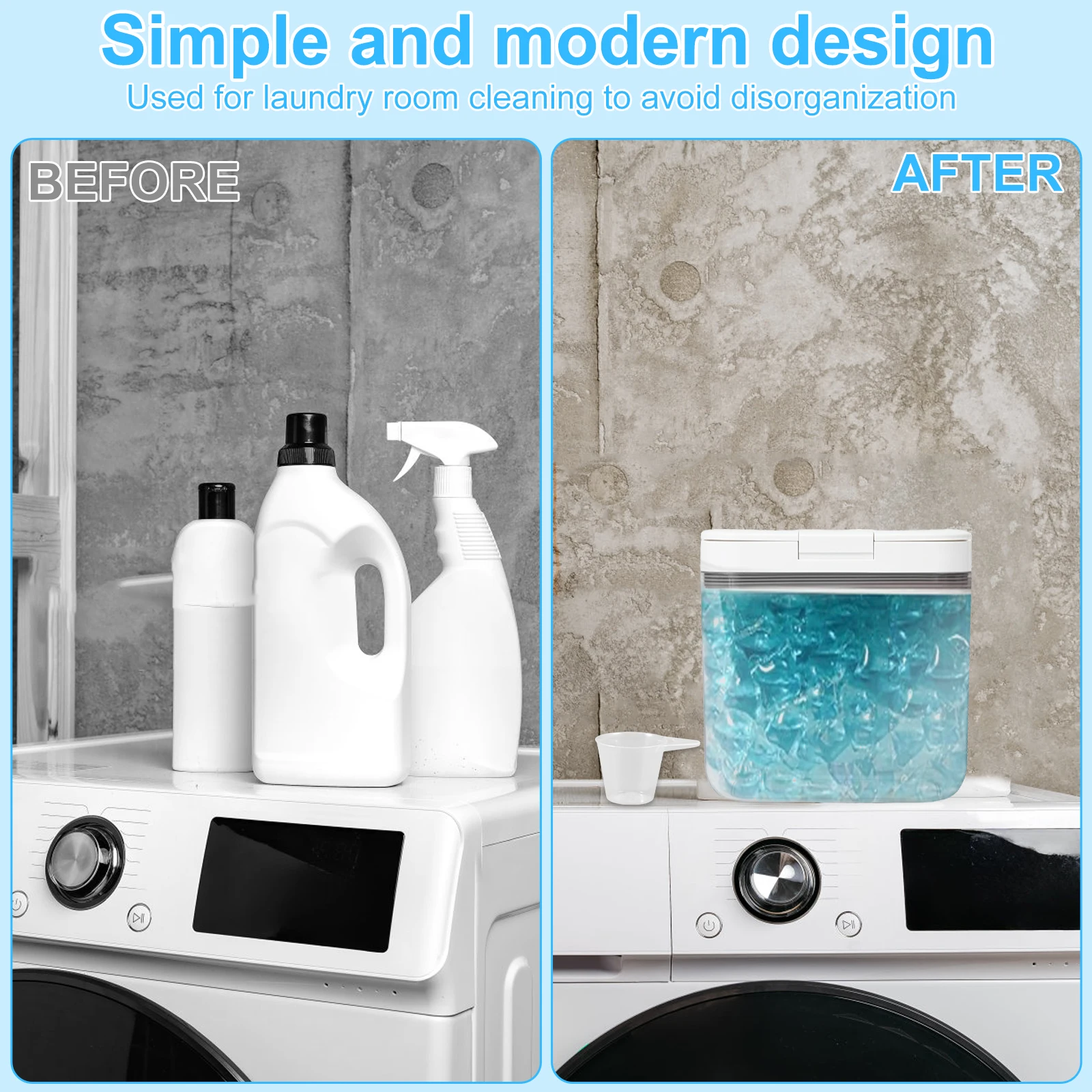 [High Quality Material & Sealed] This laundry pods container is made of high quality ABS and PP, highly transparent and durable. The lid has a double seal design to ensure your laundry accessories are protected from water, dust and dirt. The included measuring cup makes you easy to access your laundry pods or laundry detergent