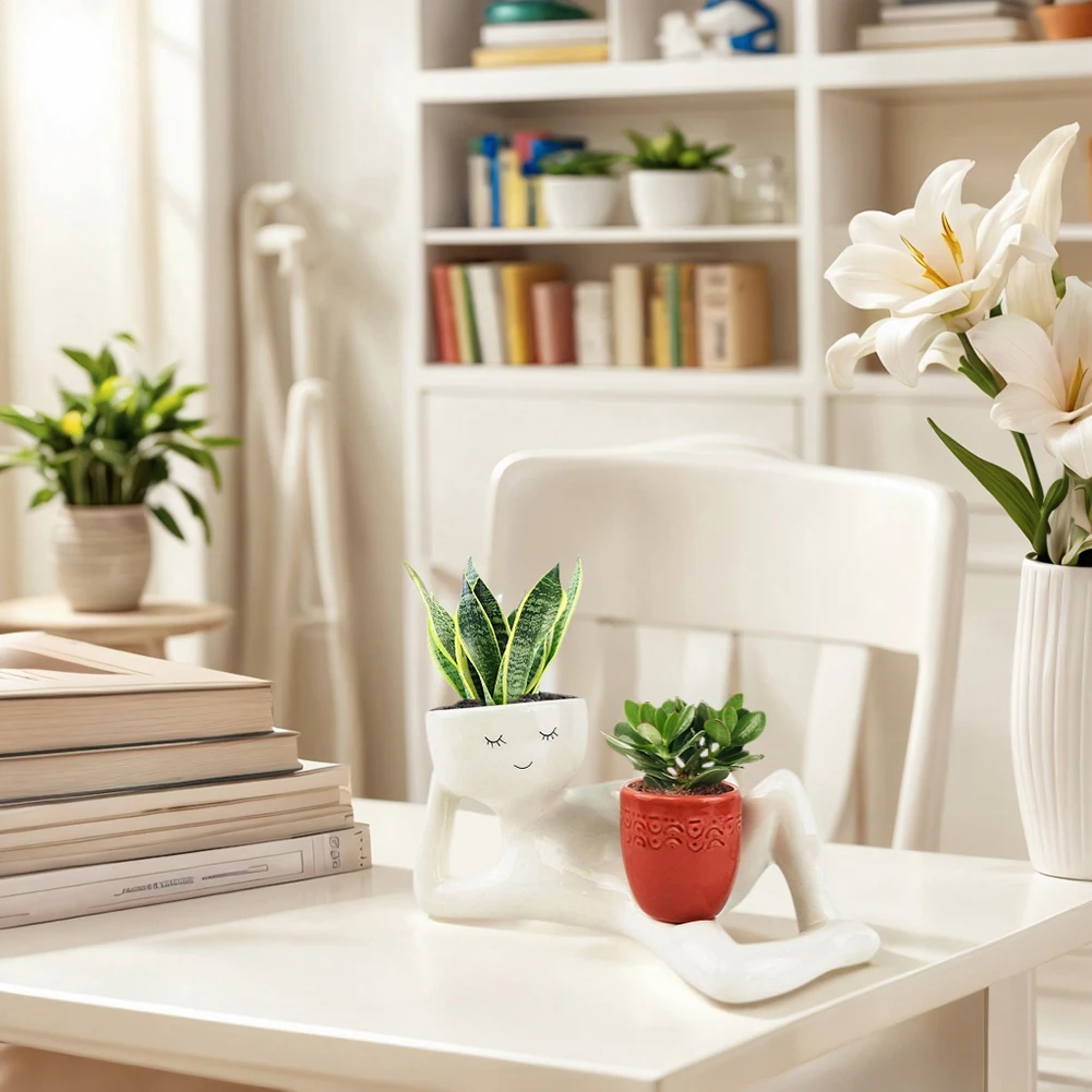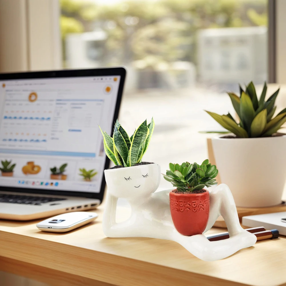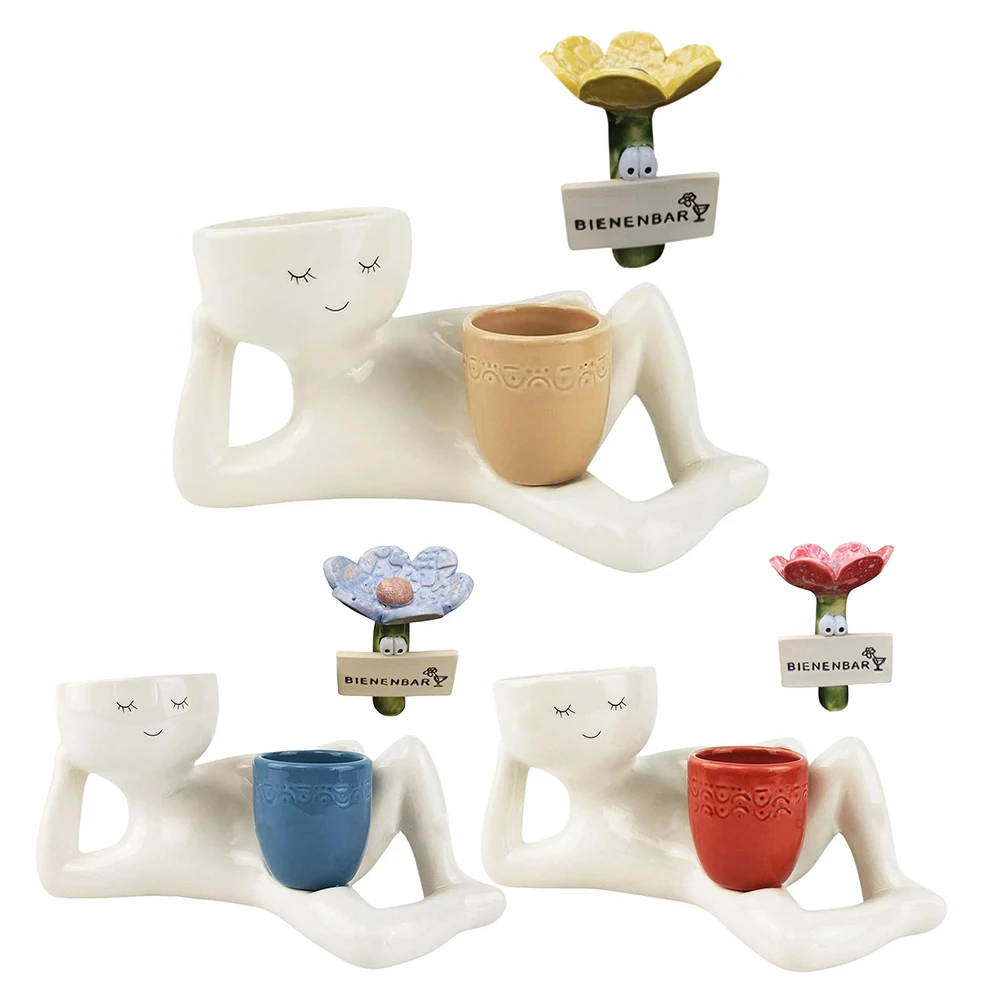 1.Playful Design: This lazy guy planter brings a touch of comfort to busy lives. Its unique shape is eye-catching and charming. Measuring 4.53*9.84 inches with two planting slots, it's perfect for small plants. You'll also receive a flower-shaped water station for bees and butterflies.