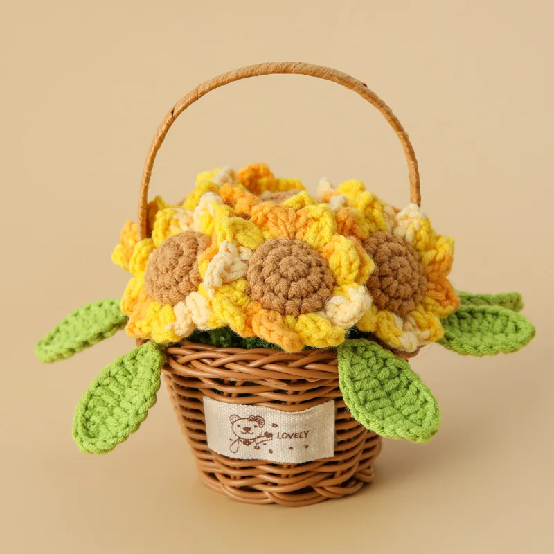 Lovely Hand-Knitted Sunflower Basket Romantic Crochet Wedding Flowers Home Offic