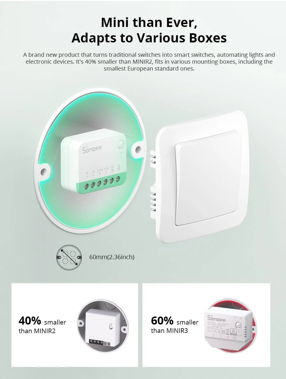 MINIR4M is equipped with an ESP32 chip, its tiny size fits in various mounting boxes, including 86/EU type, 120 type mounting box. MINIR4M supports external switch control and easily connects to the momentary switch, door exit switch, SPDT switch, latching switch, and even dry contact sensors.