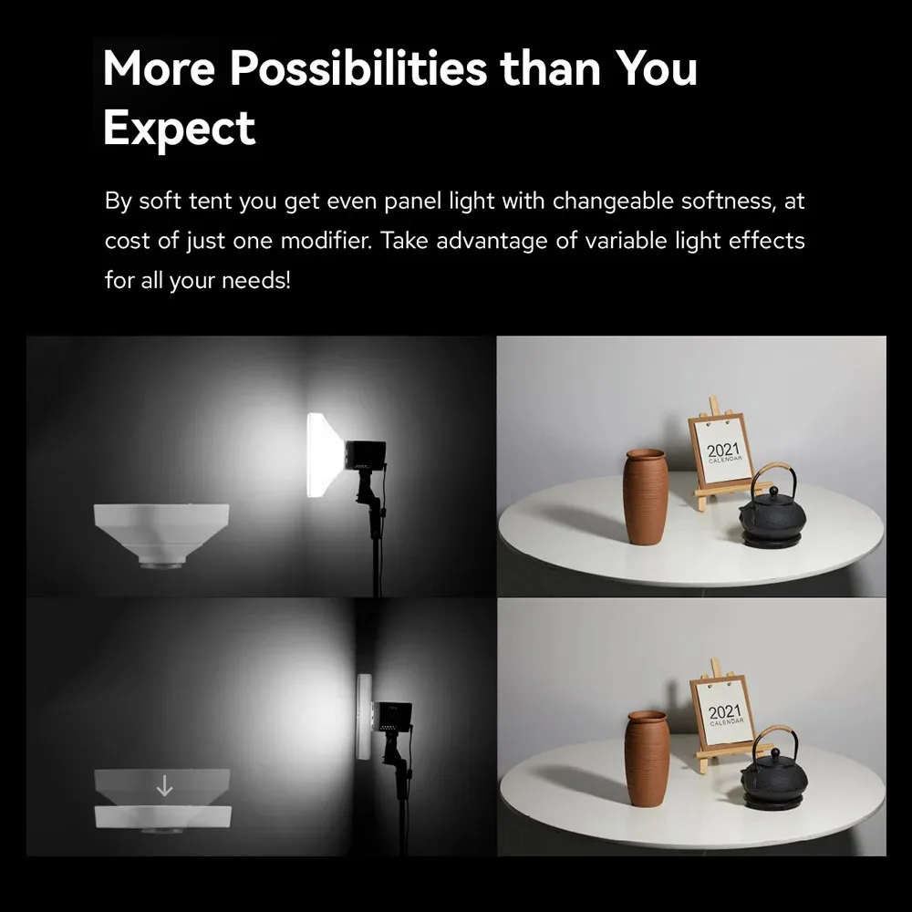 Excellent light softening effects, make lighting softer and more uniform, reducing shadows and glaring.