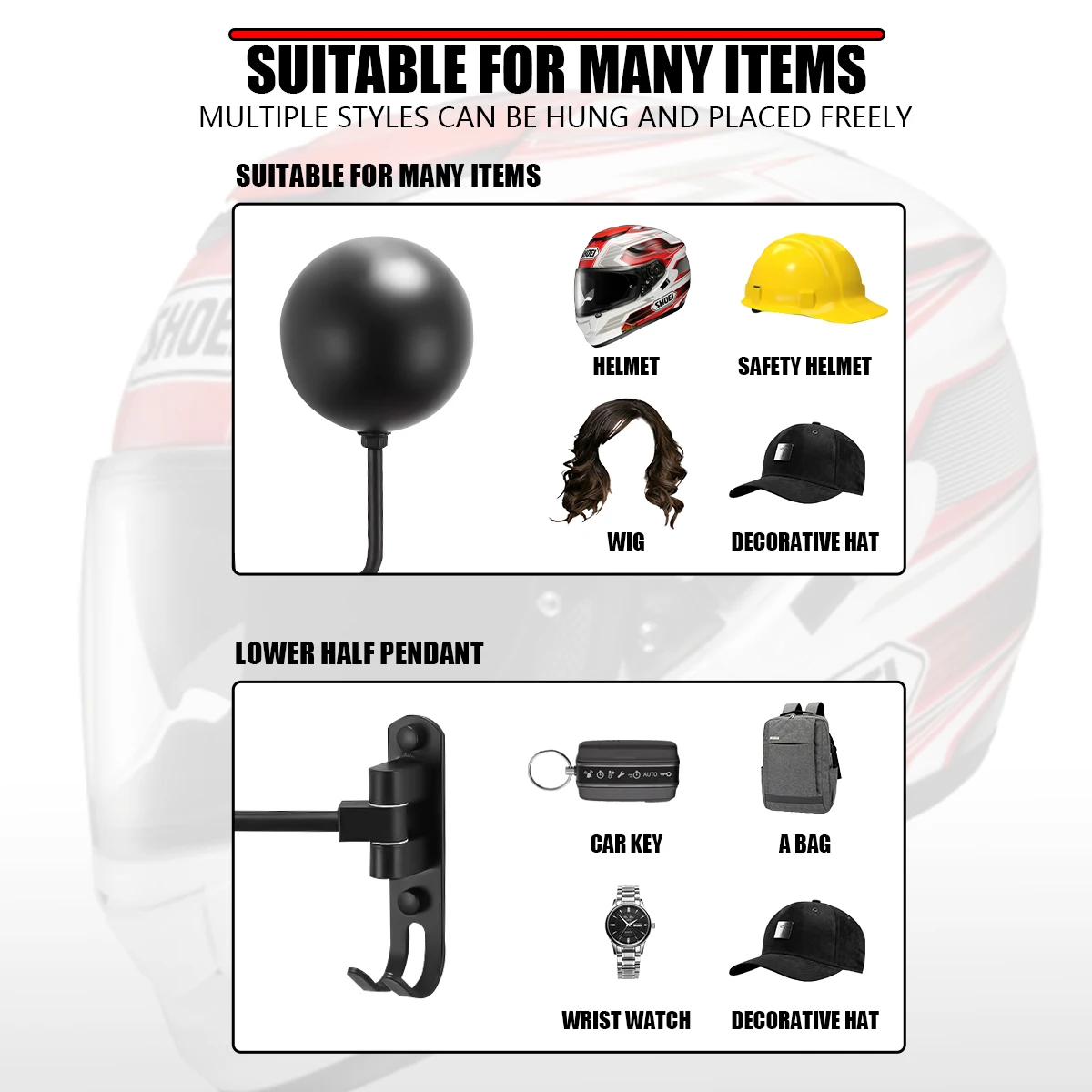 [Protect Helmet & With Hook] The part in contact with helmet is spherical, larger contact area can protect helmet better. Bottom with hooks, you can hang motorcycle keys, clothes, backpacks, etc.