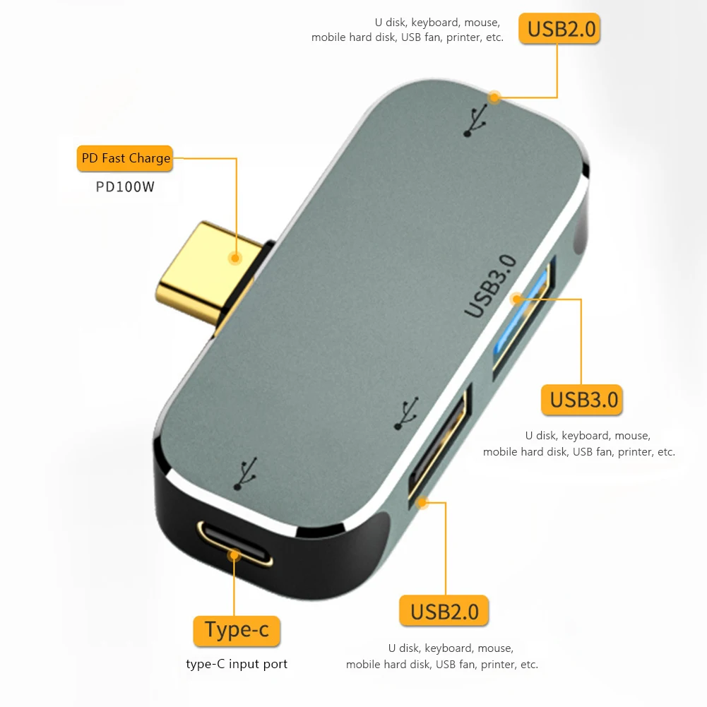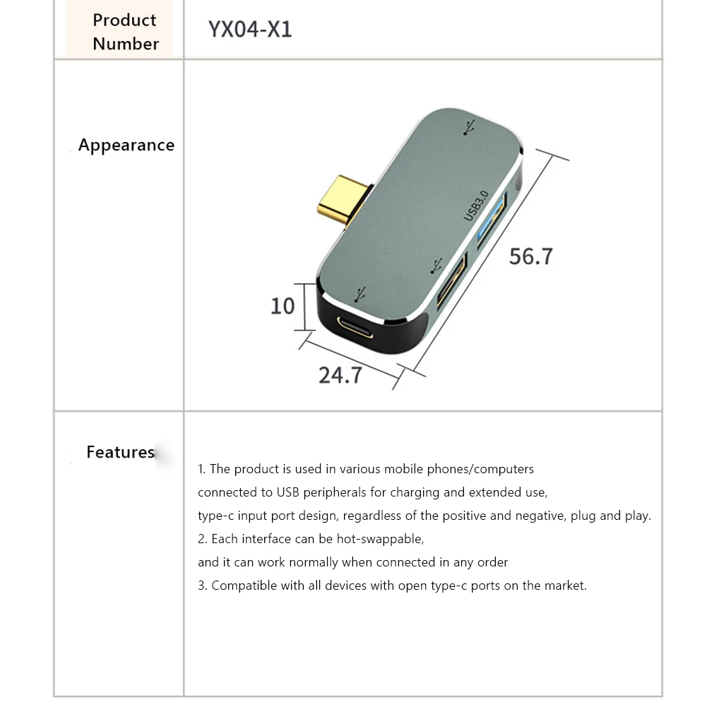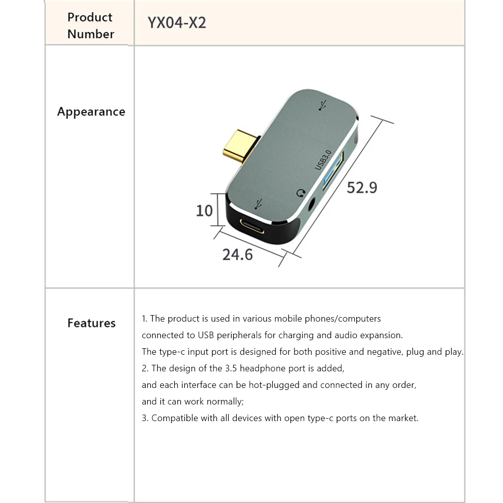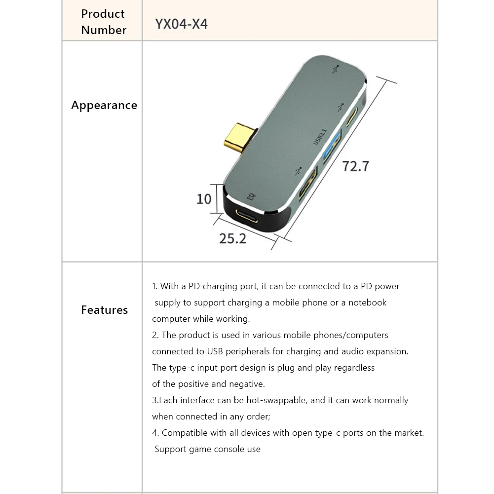 Type-C Extension Hub 3.55mm Jack PD100W USB3.0/USB2.0/USB3.1 HDMI-Compatible USB Extender PC Computer Laptop Splitter Accessory Feature: Multi port expansion, more than one wonderful side. Get rid of the problem of single interface of thin and light notebook, and connect more devices: USB flash disk, keyboard, mouse, mobile hard disk, USB small fan, printer, etc 3.55mm earphone hole, comfortable listening to music and charging. 3.55mm audio interface, support stereo sound effect, connect headphones / audio, etc., and ensure the right combination of office and entertainment (YX-X2, YX-X3, YX-X5 support this function) PD100W fast charging, with PD charging port Connect the PD power supply to support charging the mobile phone or laptop while working, and support PD3.0 fast charging protocol, charging power up to 100W, support for NS game console, and all interfaces can be hot plugged (YX-X3, YX-X4, YX-X5 support this function) With USB3.0 interface / USB2 0 interface, which can connect multiple USB devices at the same time. USB 2.0: speed 480mbps, downward compatible with USB 1.1, output power 5V / 500mA; USB 3.0: the speed supports up to 5Gbps, 1GB files are transmitted in 3 seconds. Downward compatible with USB 2.0 / 1.1, output power 5V / 900mA; Type-C: USB2. 0 480mbps transmission rate, maximum output power 5V / 1.5A HDMI-Compatible conference projection, multi person shared office. 4KHD dual screen display, connected to projectors, TVs, monitors and other large screens for more efficient office. (only YX-X5 has this function) The product is applicable to various mobile phone / computer connection, USB peripheral charging and audio expansion. The Type-C input port is designed for plug and play regardless of positive and negative. Highly compatible. For NS game console / For apple / Android / For ipad / computer can be used. Compatible with all devices with open Type-C ports on the market Specification: Product model: YX04-X1, X2, X3, X4, X5 (optional) Product color: Silver Product interface: YX-X1: 1xUSB3.0/1x Type-C(2.0)/2xUSB2.0 YX-X2: 1xUSB3.0/1x Type-C(2.0)/1xUSB2.0/1x3.5 Audio Jack YX-X3: 1xUSB3.1/1x Type-C(2.0)/1xUSB2.0/1x3.5 Audio Jack/1xPD YX-X4: 1xUSB3.0/1x Type-C(2.0)/2xUSB2.0/1xPD YX-X5: 1xHDMI-Compatible/1xUSB3. 1/1xUSB2.0/1x3.5 Audio Jack/1xPD Product power: 100W Product material: PVC + aluminum alloy shell Supporting systems: For Windows, for Android, for MacOS Product weight: 15g Product Size: 63x24mm Product size: as shownNote: Due to the different monitor and light effect, the actual color of the item might be slightly different from the color showed on the pictures. Thank you! Please allow 1-2cm measuring deviation due to manual measurement. 1 x Type-C Hub |