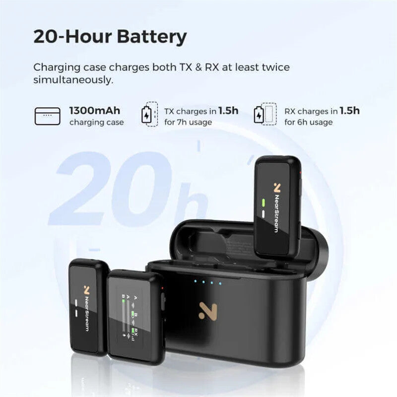 Ultra-Compact & All-in-One Ready to Use:The NearStream AWM20T is an incredibly compact and versatile dual-channel wireless clip-on microphone system comprising a two-channel receiver, two transmitters, and a charging/storage case, all designed in a pocket-sized form factor. The receiver is auto-paired with the transmitters for effortless setup every time.