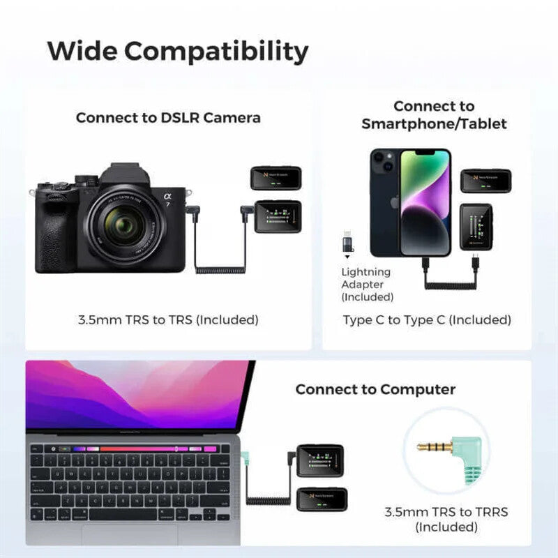Different devices mean different input adapters, and NearStream AWM20D covers them all. The receiver has USB-C, Lightning, and 3.5mm TRS ports, making it compatible with mainstream smartphones, cameras, and laptops.