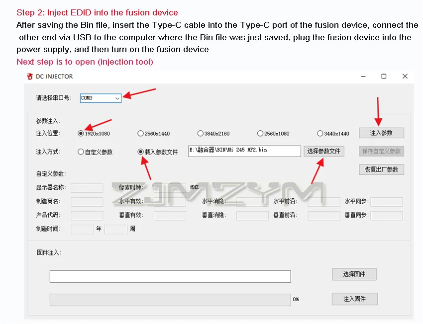 After opening, select the serial port number, choose the injection location (according to the resolution of the main monitor), select the injection method as [Load Parameter File], select the parameter file (previously read and saved Bin file), and finally click [Inject Parameters]. Wait for injection, the screen will be black during the injection process, and the completion will prompt that the parameter injection is successful. After successful injection, unplug the Type-C cable and connect the HDMI cable to use it.