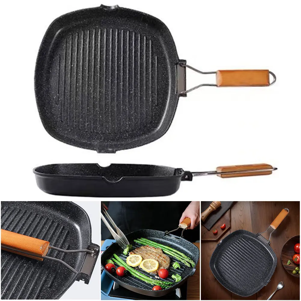Nonstick Grill Pan Foldable Wooden Handle Grill Skillet Steak Frying Pan for Meat Fish and Vegetables