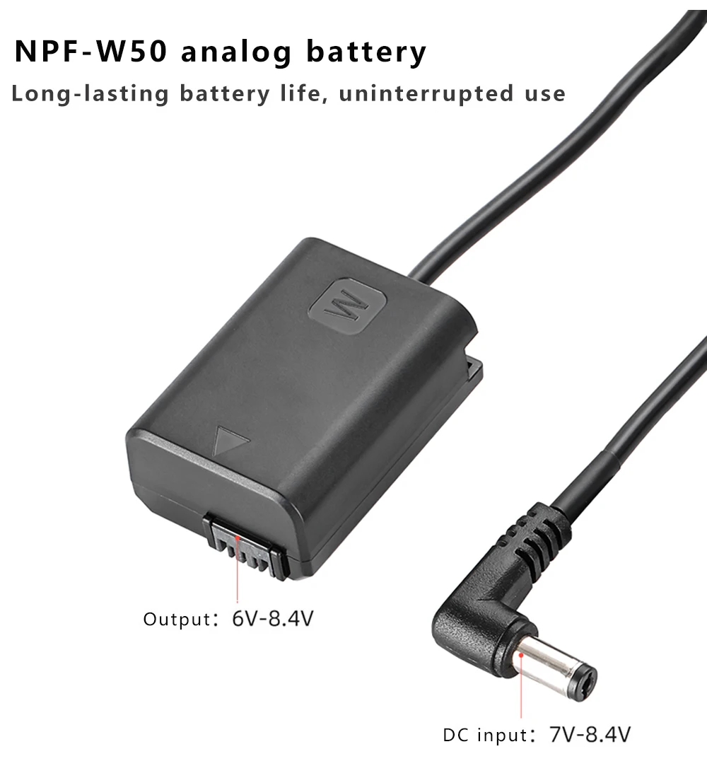 2. 5.5/2.1mm DC Power Male Connector to FW50 Dummy Battery