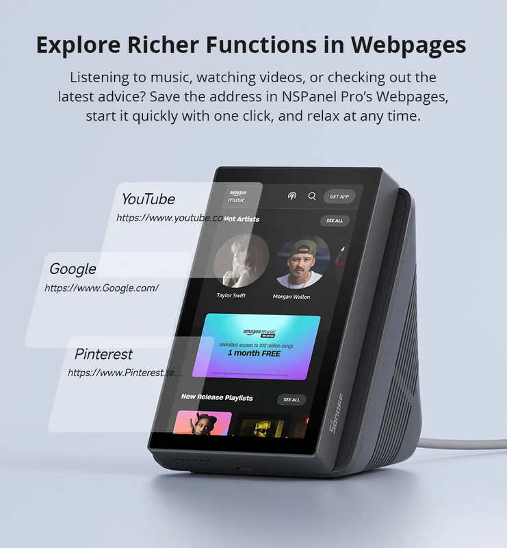 Explore WebpagesListening to music, watching videos, or checking out the latest advice? Save the address in NSPanel Pros Webpages, start it quickly with one click, and relax anytime.