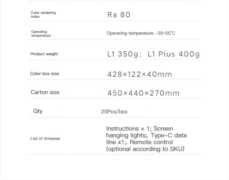 Accessories List: Manual1; Screen hanging lamp; Type-C data cable1; Remote control (Optional according to SKU)