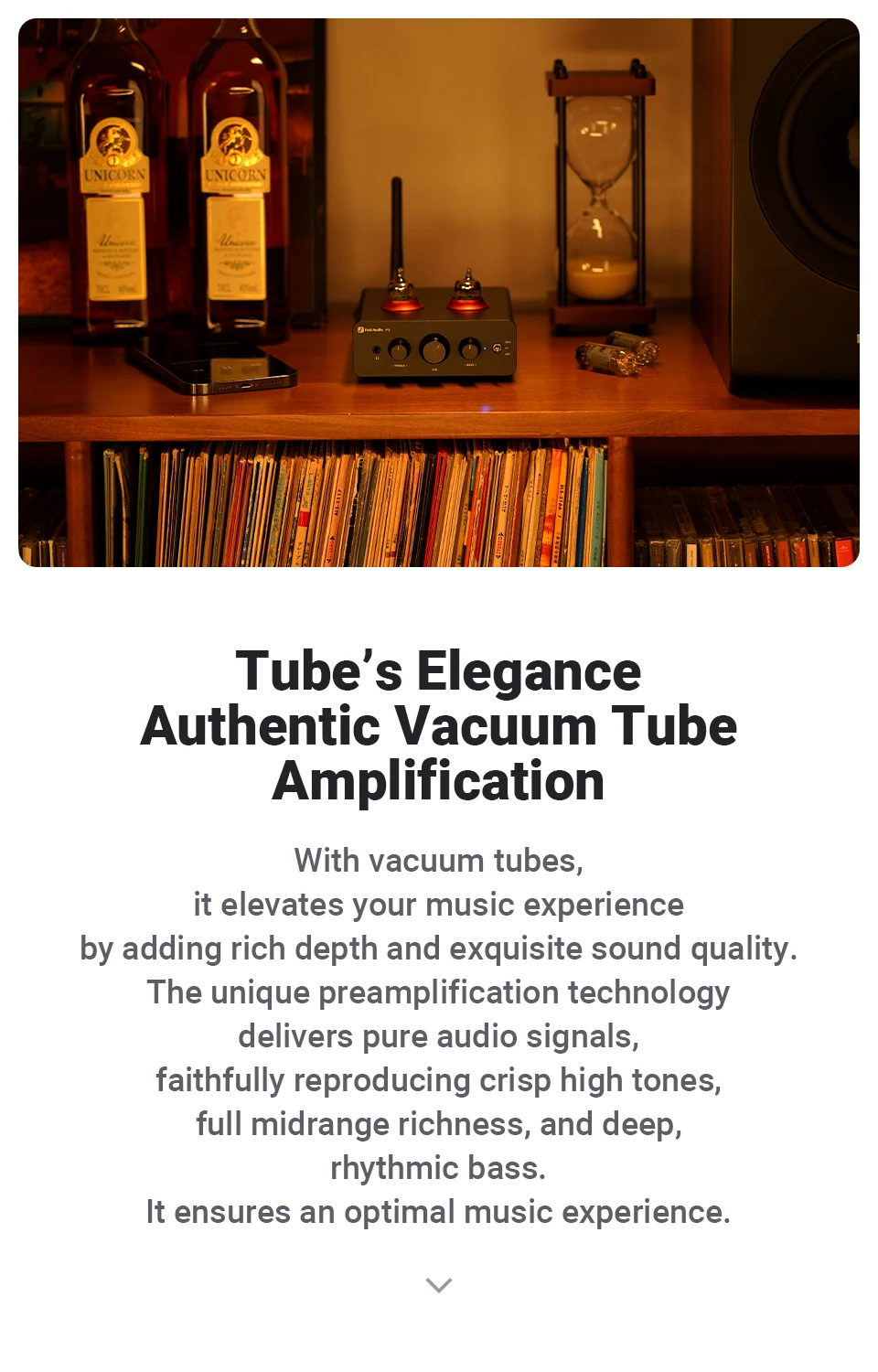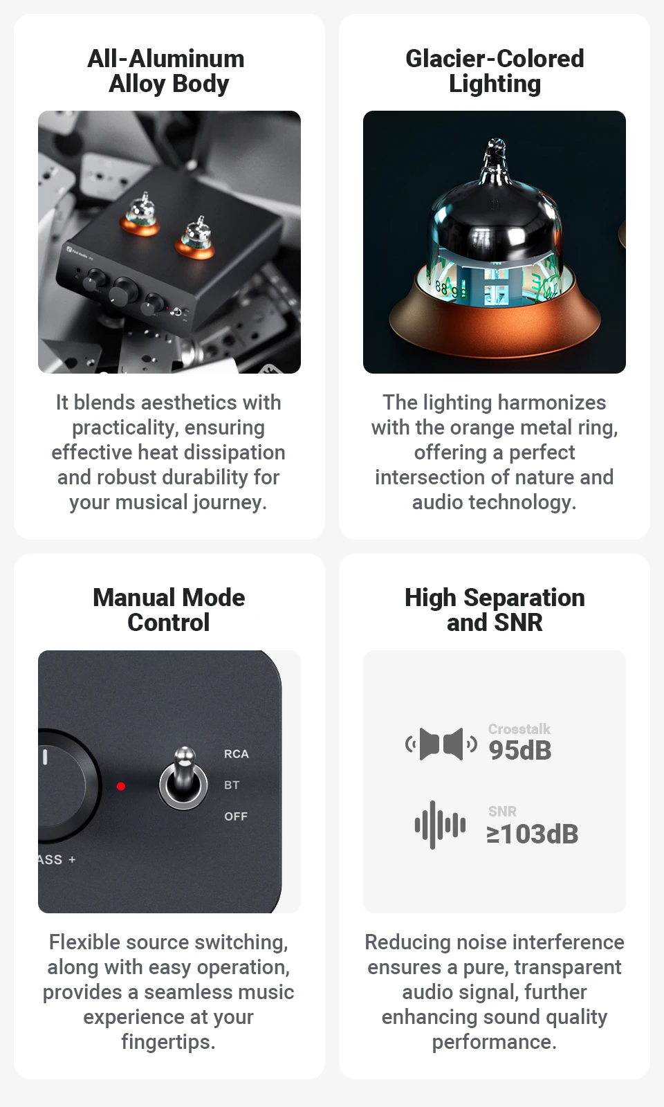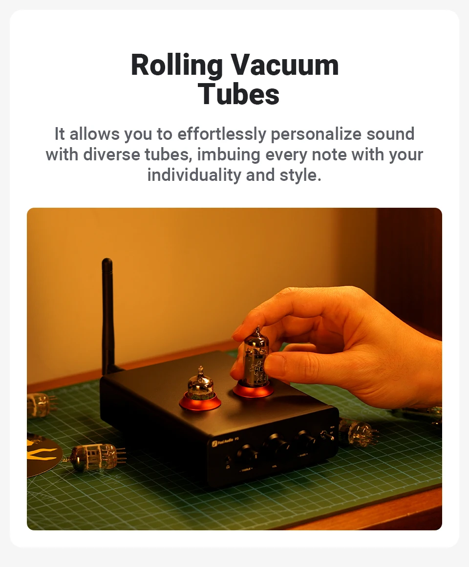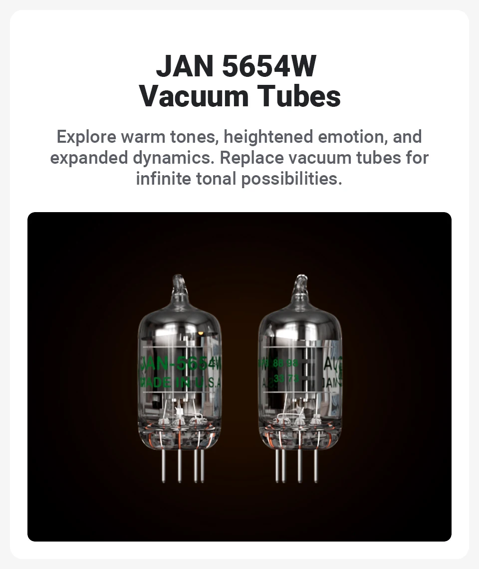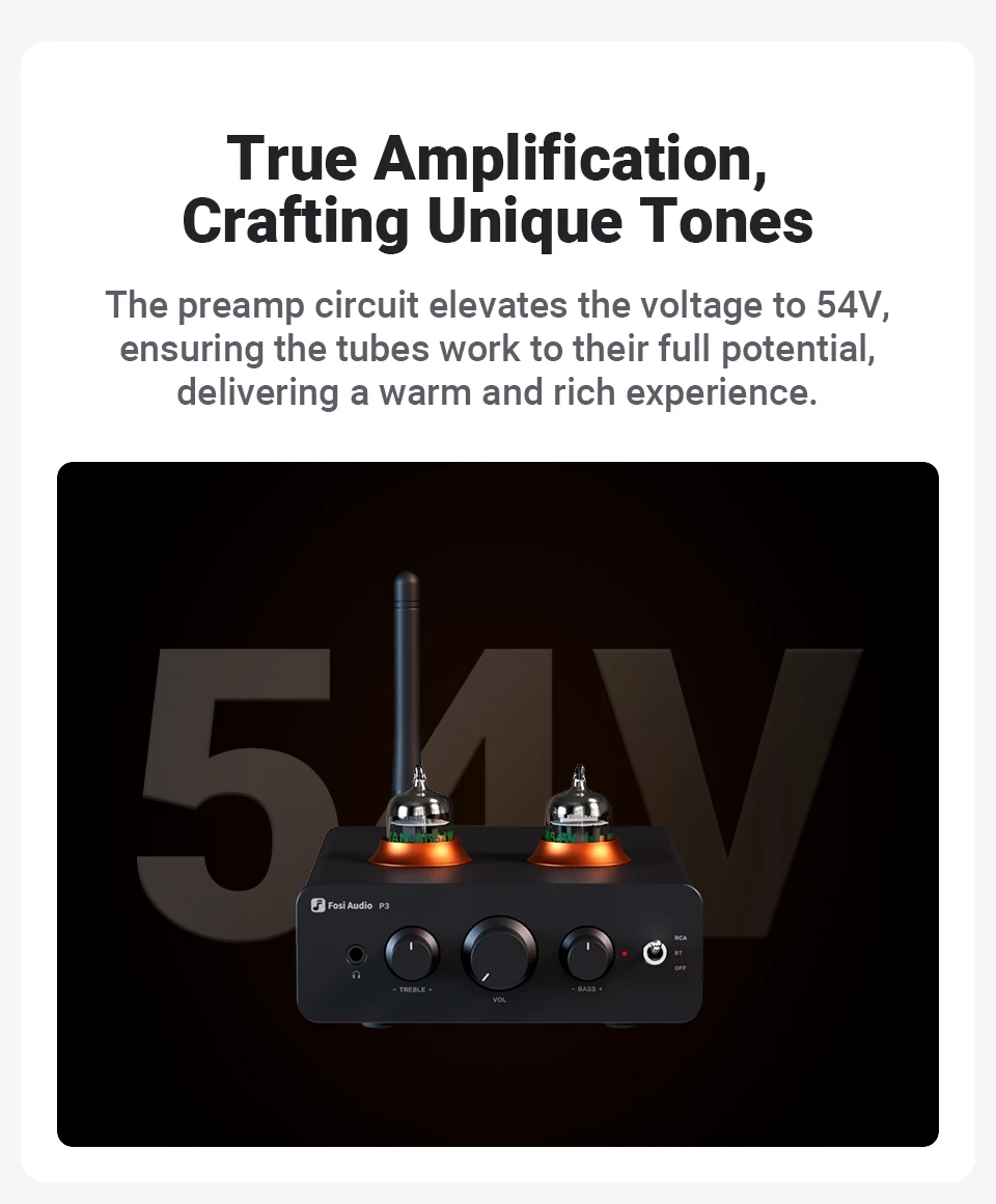 True Tube Amplification: The preamp circuit elevates the voltage to 54V, ensuring the tubes work to their full potential, delivering a warm and rich experience. The unique preamplification technology delivers pure audio signals, faithfully reproducing crisp high tones, full midrange richness, and deep, rhythmic bass.